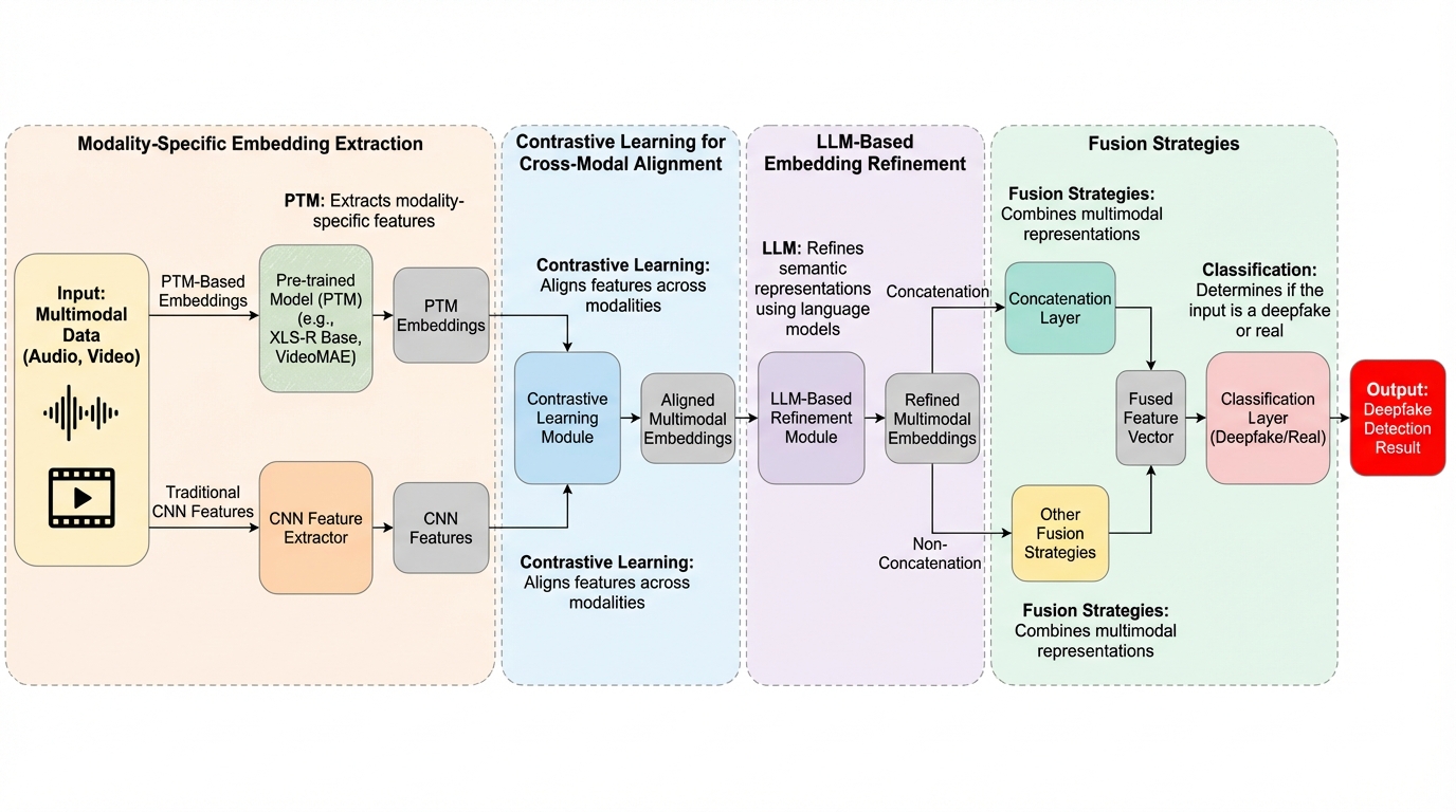 生成AIの進化により、音声と映像を組み合わせた高度なディープフェイクが社会的な脅威となっていますが、従来の検出手法は各要素を個別に処理するため、要素間の微細な矛盾を見逃す「モダリティの断片化」や「浅い相互推論」という課題を抱えていました。