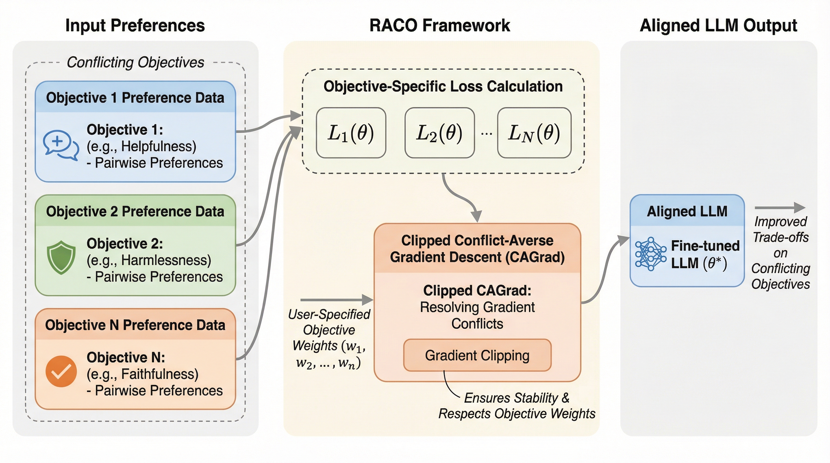 論文の第一の貢献は、Reward-free Alignment framework for Conflicted Objectives(RACO)の提案です。ポイントは、明示的な報酬モデルに頼らず、ペアワイズの嗜好データを直接使って、複数目的のアラインメントを進めるところにあります。ここでの“直接”は、目的のスカラー化を先にやってしまうのではなく、嗜好ペアという入力の形を保ったまま学習の更新を組み立てる、という態度に近いです。