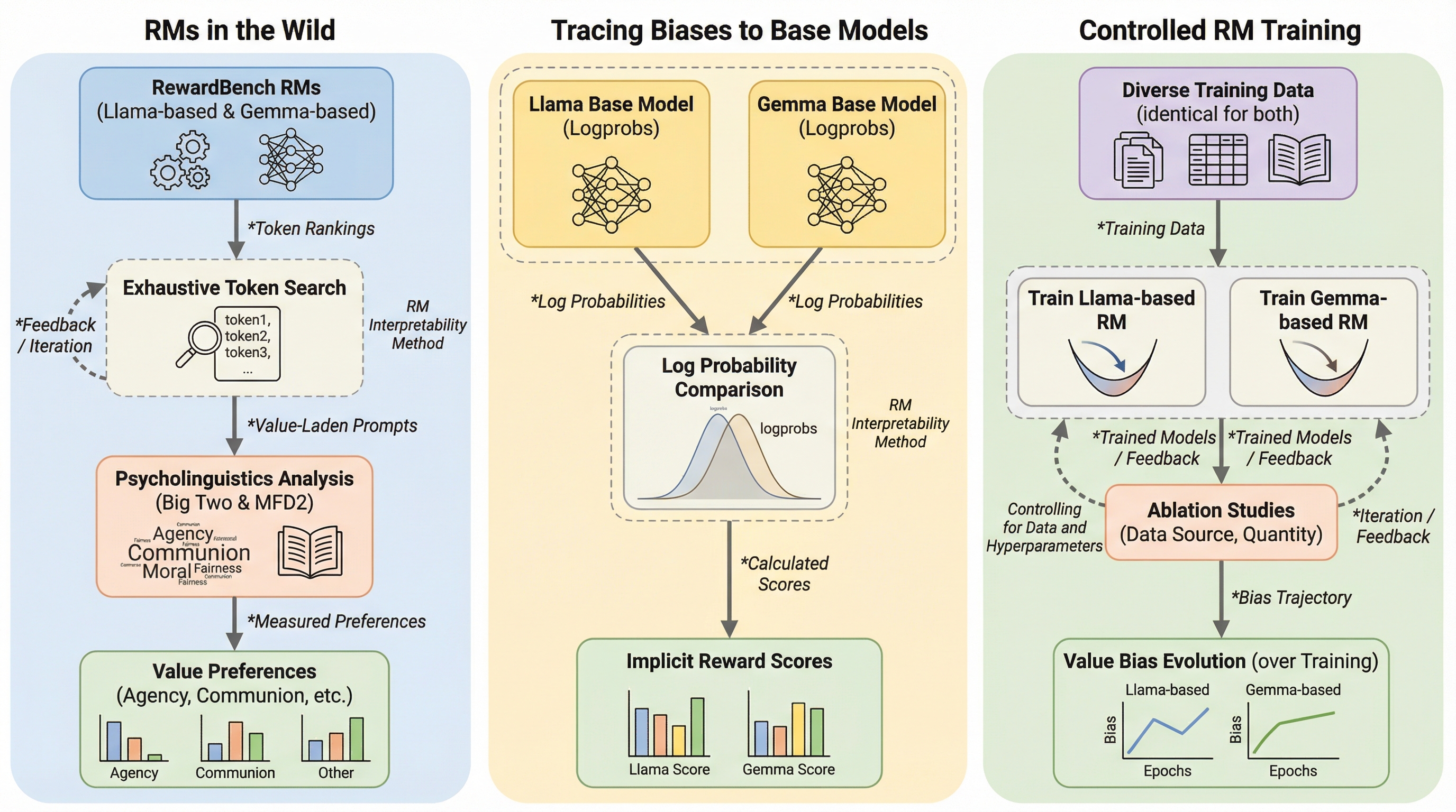 報酬モデル(RM)は、大規模言語モデル(LLM)を人間の価値観に合わせる「アライメント」の中核を担うが、初期化に使用される事前学習済みモデルから心理的なバイアスを直接継承していることが判明した。 具体的には、Llamaベースの報酬モデルは「自己主導性(Agency)」に関連する自由や成功を好む傾向があり、一方でGemmaベースのモデルは「共同体性(Communion)」に関連する愛や友情を優先する傾向が強い。 この価値観の偏りは、学習に使用する好みのデータセットや学習量を変更しても解消されにくいほど強固であり、アライメント段階だけでなく事前学習段階における安全性と価値観の設計が極めて重要であることを示唆している。