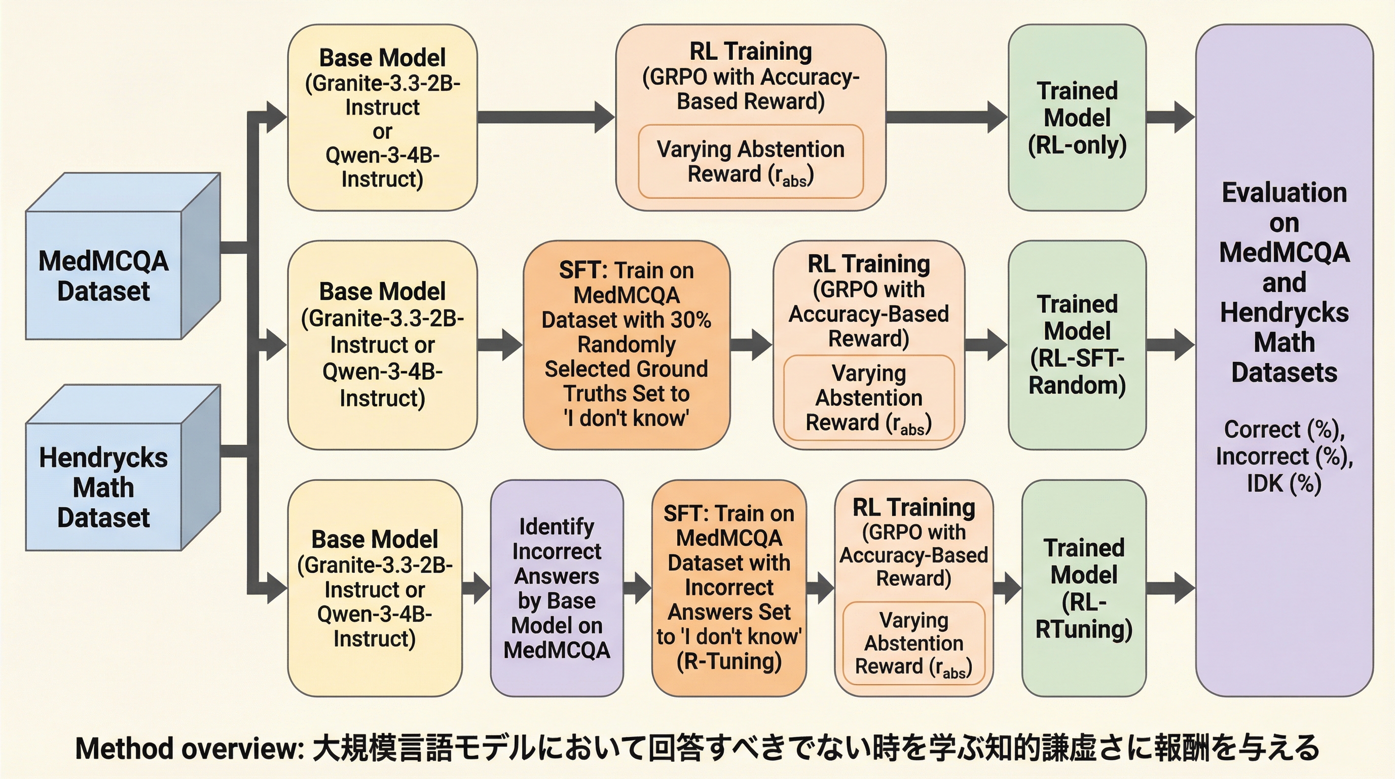 大規模言語モデル(LLM)は、専門的な業務や研究の領域において広く普及しているが、事実として誤っている情報や検証不可能な内容を自信満々に生成してしまうハルシネーションという問題に依然として直面している。この問題が発生する一因として、現在のLLMの学習目的が常に何らかの回答を生成することに報酬を与えており、不確実な場合に回答を控える(棄権する)ことを明示的に学習していない点が挙げられる。既存のハルシネーション抑制手法として、教師あり微調整(SFT)や人間によるフィードバックを用いた強化学習(RLHF)が存在するが、これらはコストが高く、人間が介在するフィードバックループに大きく依存している。 本研究では、モデルが自身の知識の限界を認識し、不確実なときには「分かりません(I don't know)」と答える「知的謙虚さ」を身につけることが、信頼性の高いAIを構築するために不可欠であると考えている。特に医療分野(MedMCQA)や高度な数学問題(Hendrycks Math)のような、正確性が極めて重要視されるドメインにおいては、誤った情報を提示するよりも、分からないことを認める能力が重要となる。…