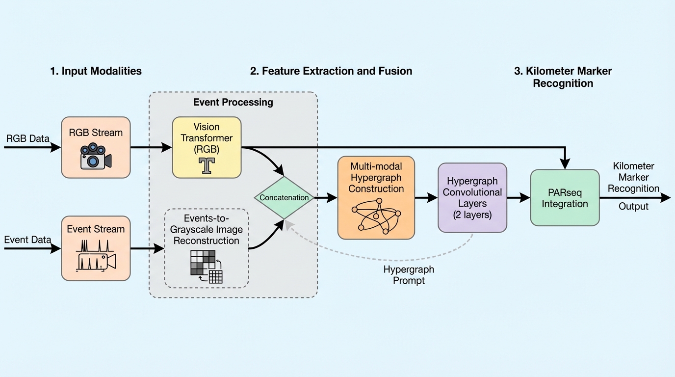 HGP-KMR は、通常の RGB 画像だけでは厳しい地下鉄環境のキロ程標認識に対し、イベントカメラ由来の情報を hypergraph prompt として foundation model 側へ注入することで精度を上げる手法です。 あわせて EvMetro5K という 5,599 組の RGB-Event ペアからなる専用データセットを整備し、EvMetro5K で 95.1% 精度、PARSeq 比 +3.4 ポイントを達成しています。 面白いのは、単に RGB と event を結合するだけでなく、両モダリティの高次関係を hypergraph として表現し、それを prompt 的に RGB backbone 各層へ注入した点です。単純融合より精度は高く、推論速度も 89 FPS と実用圏に収まっています。