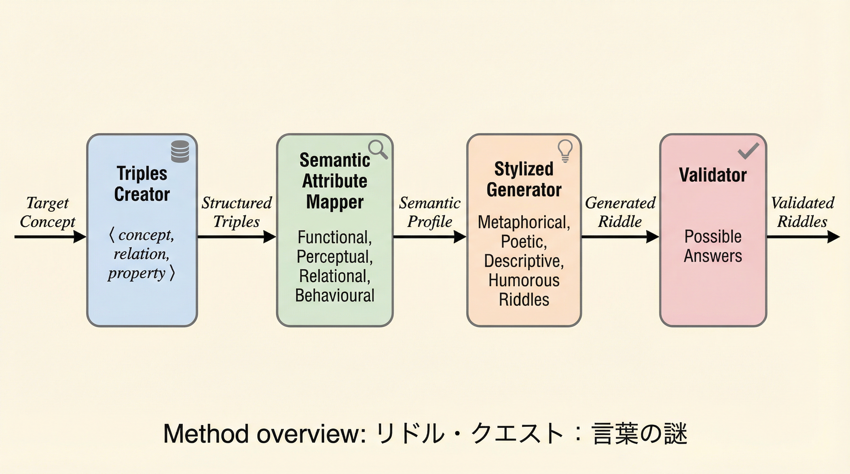 本研究の核心は、類推に基づくなぞなぞを生成し、その解答の網羅性を評価するための、高度にモジュール化された新しいパイプライン「リドル・クエスト」の提案にある。このシステムは、特定の教育用オントロジーに依存していた従来の手法とは異なり、オープンな領域の概念知識を活用することで、物理的な物体から抽象的な概念までを自在に扱えるよう設計されている。提案されたパイプラインは、対象概念の構造化、属性の抽出、スタイルの適用、そして解答の検証という四つの主要なプロセスで構成されている。これにより、単なるテンプレートの流用ではなく、概念の意味的な特徴に基づいた創造的な問題作成が可能となった。 具体的には、記述的、比喩的、詩的、ユーモラス、そしてシチュエーション重視といった五つの異なるジャンルでの生成をサポートしている。…