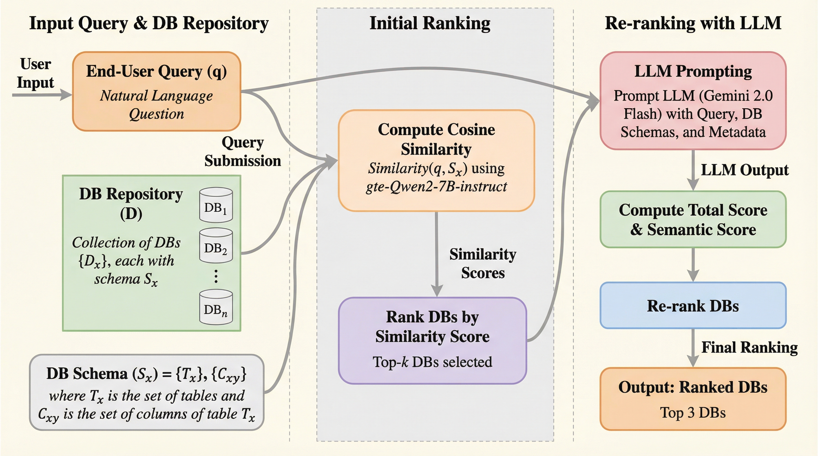 大規模な企業環境において、ユーザーの自然言語による質問を分散した多数のデータベースの中から最も適切なものへ自動的に振り分ける「クエリルーティング」の精度を向上させるため、既存のベンチマークを大幅に拡張した「Spider-Route」と「Bird-Route」を構築し、評価の妥当性を高めました。 提案された「モジュール式推論再ランキング戦略」は、大規模言語モデル(LLM)による意味的な整合性確認と、スキーマの被覆率やテーブル間の接続性を検証するアルゴリズムを組み合わせることで、従来の埋め込みベースの手法や直接的なLLMプロンプティングを大幅に上回るルーティング精度を達成しています。 この手法は、データベースのスキーマが頻繁に変更される実環境を考慮した「トレーニングフリー」な設計であり、ドメインが重複する複数のデータベースが存在する複雑な状況下でも、クエリの意図を正確に解釈して適切なデータソースを特定できることが検証されました。