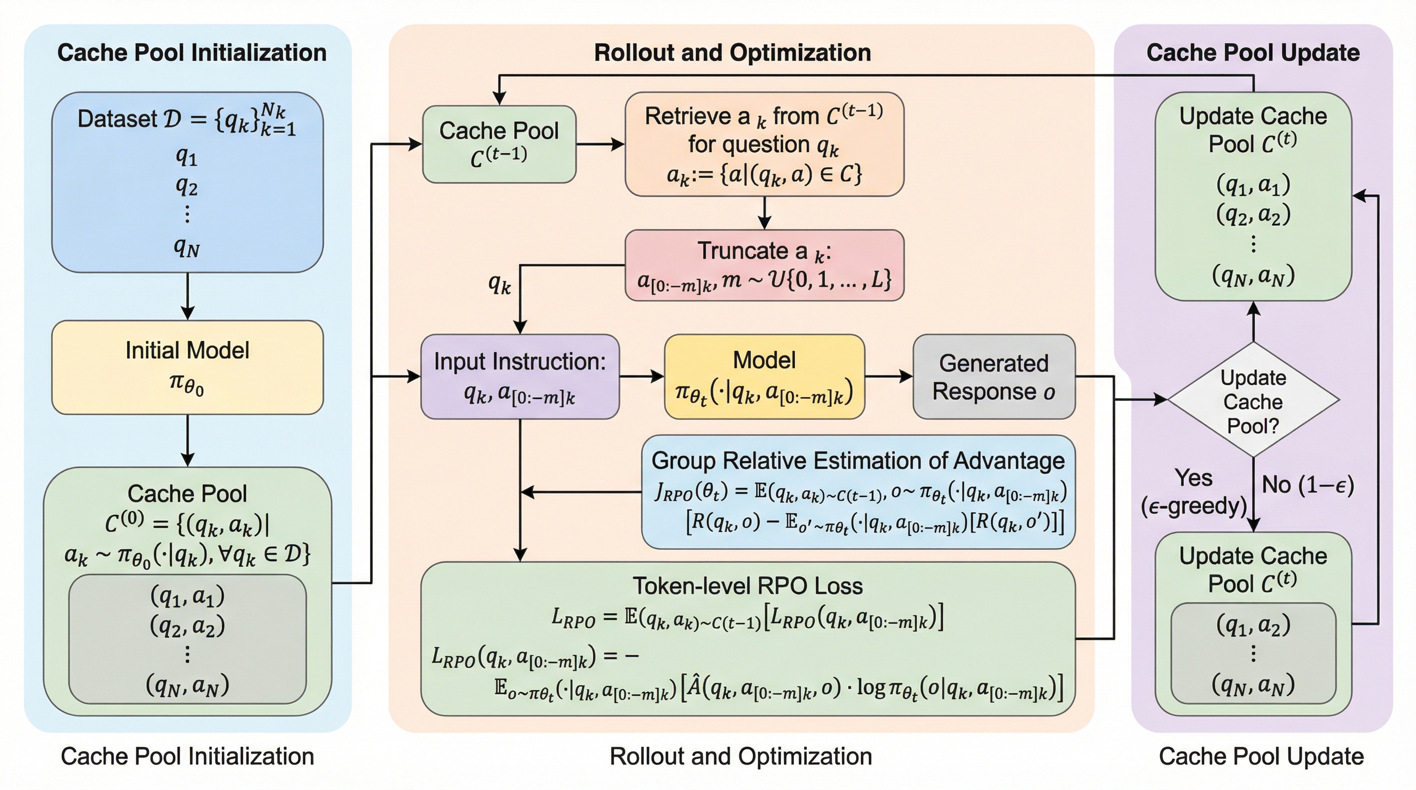 大規模言語モデルの強化学習において、推論の全行程を毎回ゼロから生成する非効率性を解消するため、過去の正解パスの接頭辞を再利用して末尾のみを生成・最適化する「RPO(部分的推論最適化)」が提案されました。 この手法は、キャッシュされた成功例をヒントとして活用することで、トレーニング中のトークン生成量を約95%削減し、1.5Bモデルで90%、7Bモデルで72%という劇的な学習時間の短縮と計算リソースの節約を実現しています。 既存のGRPOやDAPOに容易に組み込める設計であり、学習の不安定性や推論の崩壊を抑制しながら、主要な数学・推論ベンチマークにおいて従来手法を上回る性能向上と、多ステップ学習における高い安定性を達成しました。