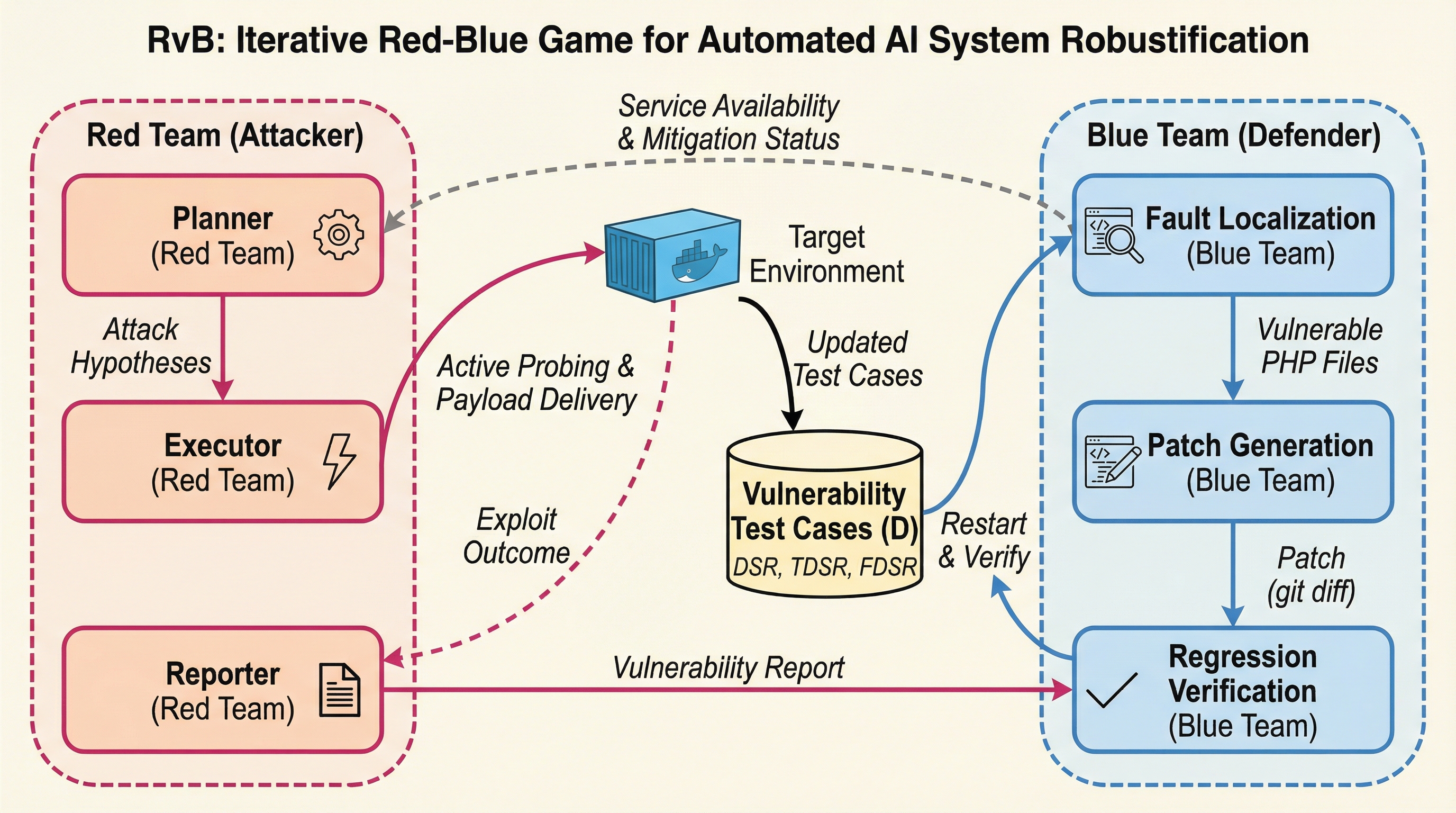 RvBは、大規模言語モデルの安全性を飛躍的に高めるために開発された、学習や微調整を一切必要としない革新的な自動堅牢化フレームワークであり、攻撃を担うレッドチームと防御を担うブルーチームが対話的に試行錯誤を繰り返す「不完全情報ゲーム」として設計されている。 この手法は、モデルの内部パラメータを更新する代わりに、外部メモリとしてのシステム状態を更新することで、未知の脆弱性に対する適応能力を継続的に向上させ、特定の攻撃手法に過剰適合しない汎用的な防御策を自律的に構築することを可能にする。 実際の検証において、コードの脆弱性修正で90%、プロンプト注入対策で45%という高い防御成功率を達成し、誤検知をほぼゼロに抑えつつ、既存の協調型システムを上回る圧倒的な性能とリソース効率、そして未知の脅威に対する高い一般化能力を実証した。