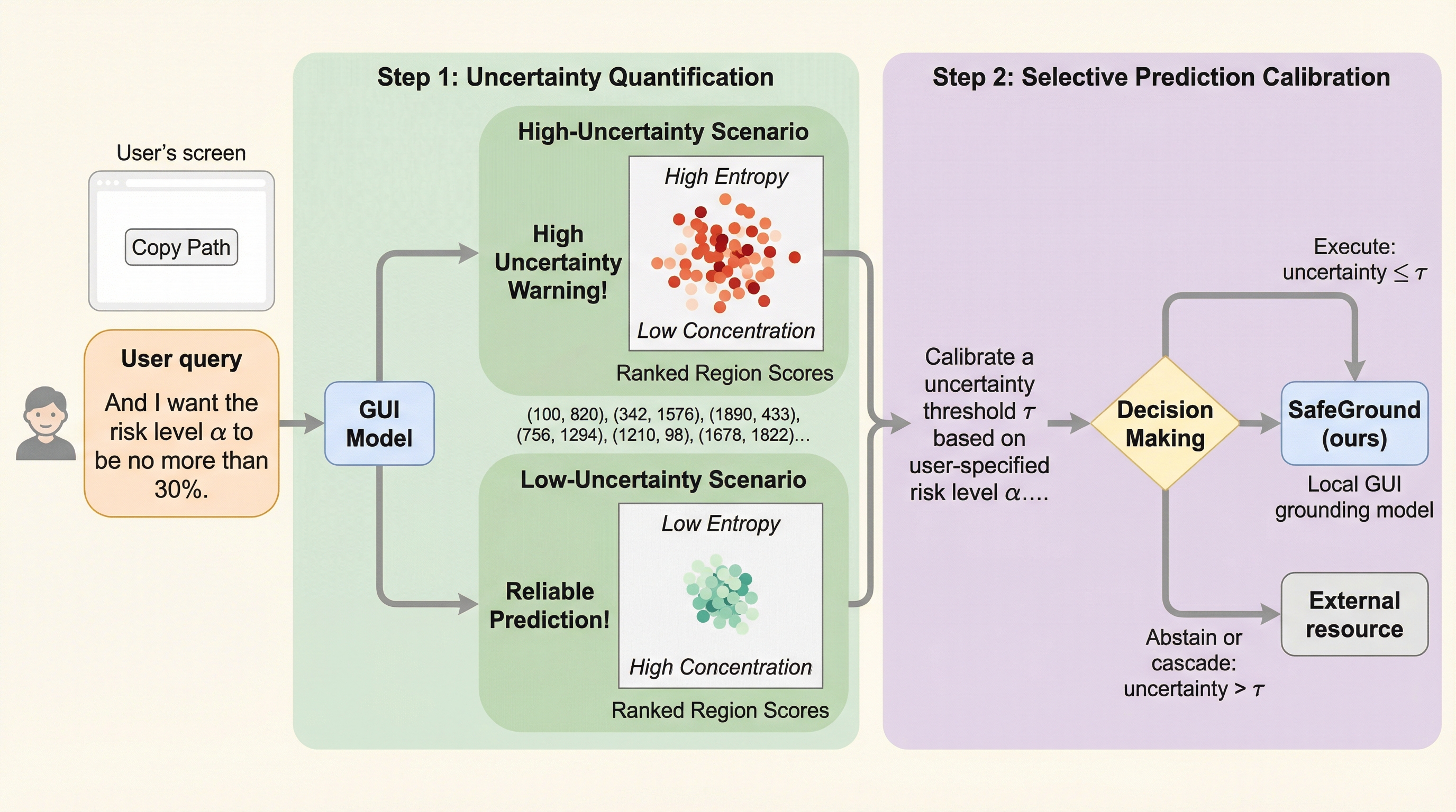論文が提案するのは SafeGround です。 既存の最先端GUIグラウンディングモデルに“後付け”で組み込み、モデル内部に触れずに、リスクを意識した予測を可能にする不確実性フレームワークとして位置づけられています。ここでの狙いは、モデルを作り替えることではなく、運用の意思決定を安全側に寄せる“追加レイヤ”を与えることにあります。