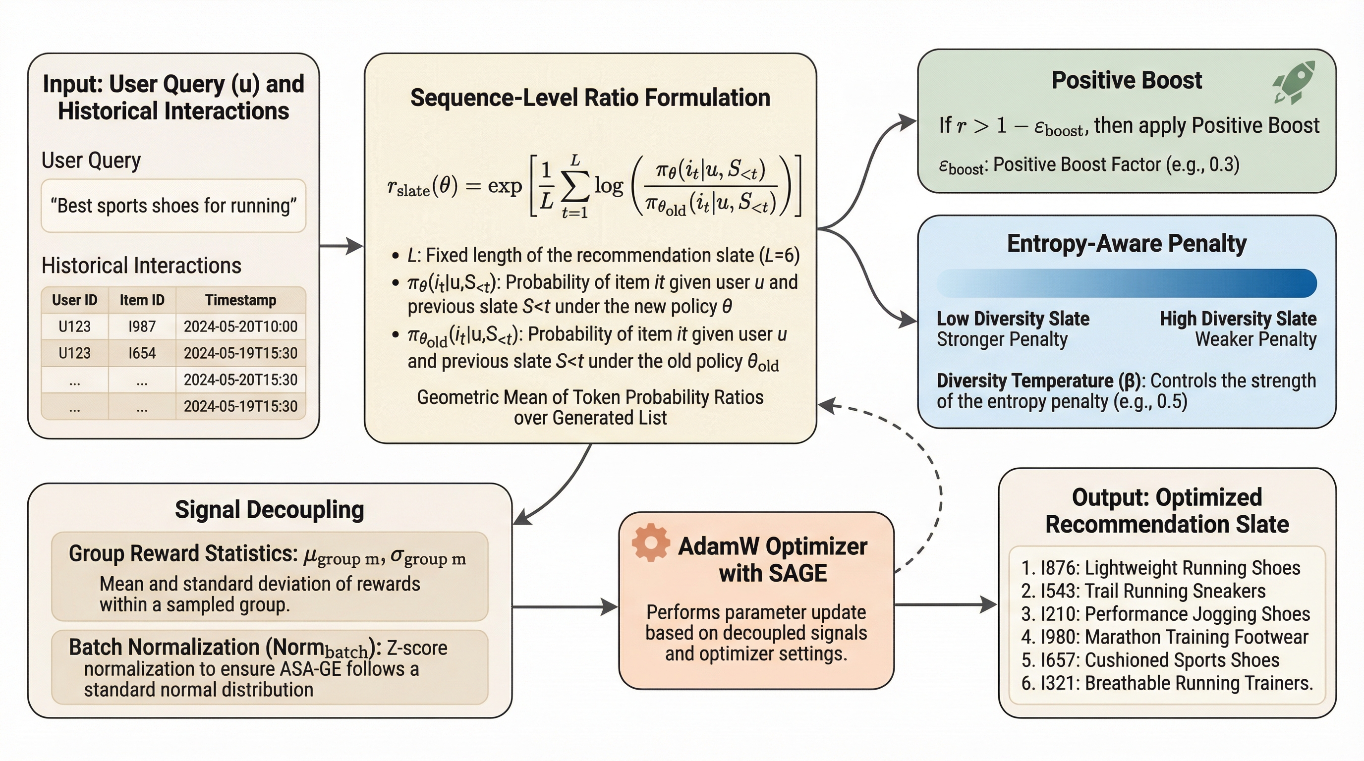 既存の生成型推薦システムが抱える専用語彙への依存と、固定的な勾配制限によるコールドスタート項目の抑制および多様性の欠如という課題を解決するため、大規模言語モデルの語彙を直接再利用しつつ、シーケンスレベルで最適化を行う新たなフレームワークであるSAGEを提案した。 SAGEは幾何平均を用いた重要度比率によってトークン単位のノイズを排除する信号デカップリングと、有望な新規項目への超線形な更新を可能にするブースト因子、および多様性の低い推薦を抑制するエントロピー考慮型罰則からなる非対称な動的勾配制御を導入している。 Amazonのデータセットを用いた検証の結果、SAGEは従来の最適化手法であるGBPOの数値的安定性を維持しながら、新規項目の露出を劇的に改善し、情報のタコツボ化を防いで推薦リストの多様性と正確性を大幅に向上させることに成功した。