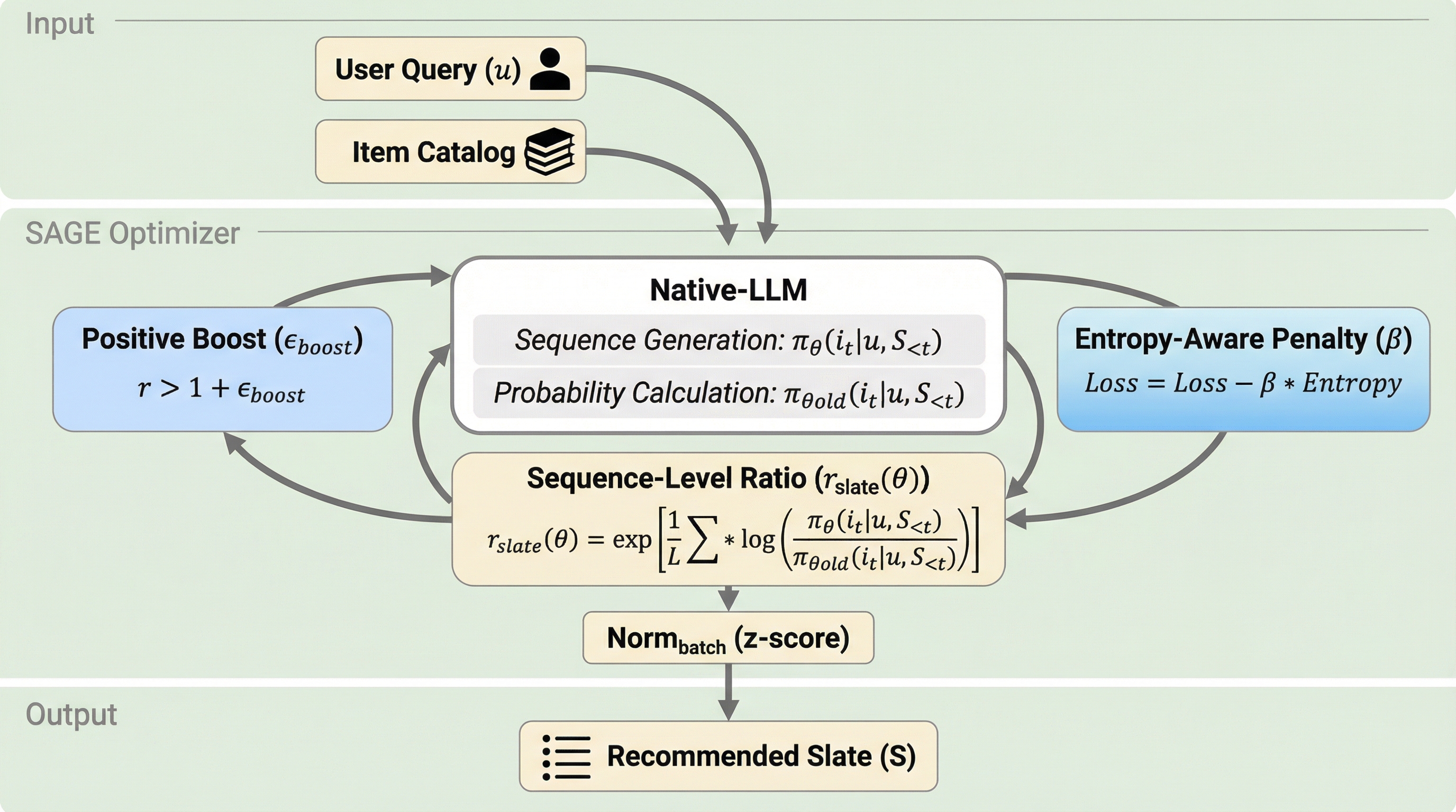 既存の生成型推薦システムであるOneRecなどは、専用の語彙構築に依存しており、これが高い維持コストや拡張性の欠如、さらには30%を超えるセマンティック衝突を引き起こしていた。また、従来の最適化戦略であるGBPOは静的な勾配境界を持つ「対称的な保守性」という問題を抱えており、コールドスタート項目の露出を44.7%減少させ、推薦の多様性を損なう要因となっていた。本研究で提案されたSAGEは、オープンソースのLLMアーキテクチャを直接再利用しつつ、シーケンスレベルの信号デカップリングと非対称な動的勾配制御を導入することで、数値的安定性を維持しながら新規項目の活性化と多様性の確保を両立させている。