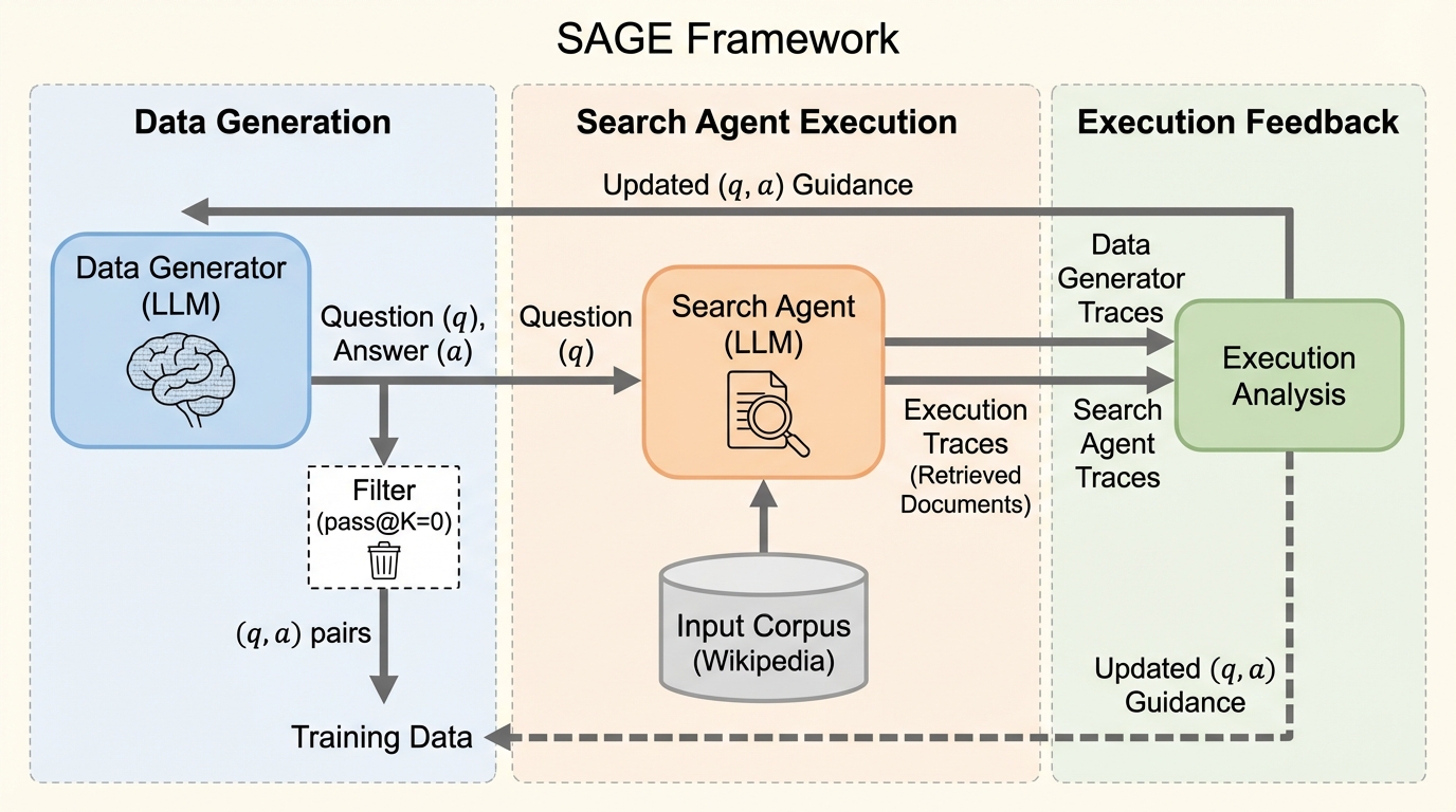 SAGEは、複数の文書を横断して推論を行うディープサーチエージェントの訓練を目的とした、難易度制御が可能な自律型データ生成パイプラインである。データ生成エージェントと検索エージェントが連携し、実際の実行結果をフィードバックとして活用することで、生成側の意図と実際の解法の乖離を解消し、高品質な質問応答ペアを自動構築する。