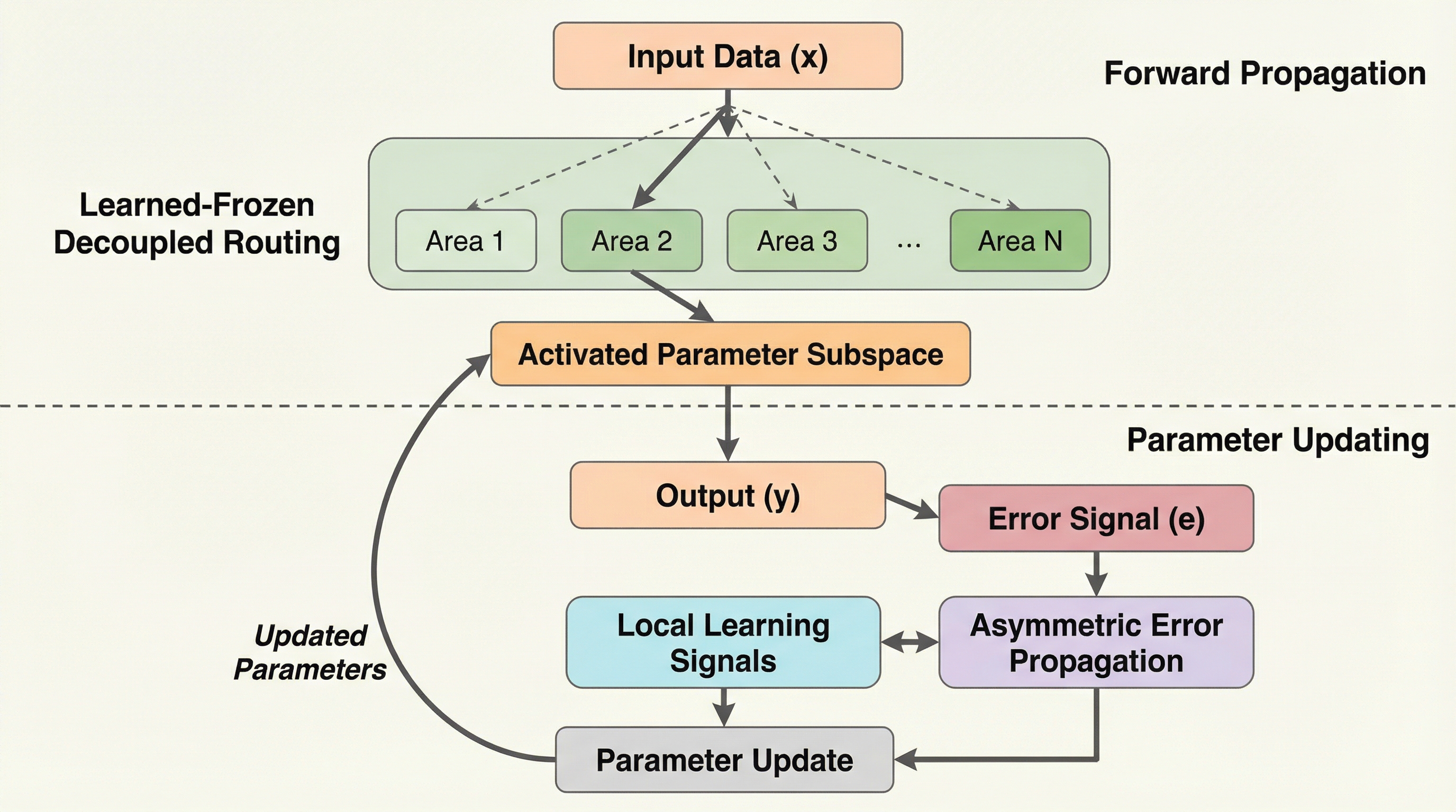 誤差逆伝播法(BP)が抱える生物学的な不自然さと、密なネットワーク表現における勾配干渉の問題を解決するため、選択的なパラメータ活性化と適応的な領域分割を組み合わせた新しい学習手法「Selective Adaptive Learning(SAL)」が提案されました。 この手法は、入力サンプルに応じてパラメータ空間を互いに排他的な領域に分割し、特定のサブ領域のみを活性化させることで、異なる意味パターン間での勾配の衝突を抑制しつつ、固定された非対称なフィードバック接続を用いることで重みの対称性問題を回避しています。 10種類の標準的なベンチマークにおいて従来のBPを上回る収束率と分類性能を示し、最大128層の深いネットワークや10億パラメータ規模の巨大モデルにおいても数値的な一貫性と高い精度を維持できることが確認されており、スケーラブルな学習の代替案となります。