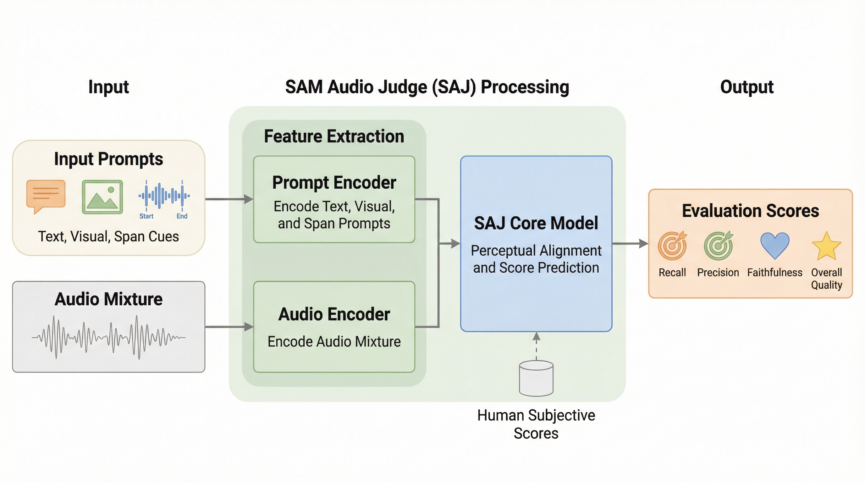 本研究では、これらの課題を解決するために「SAM Audio Judge(SAJ)」と呼ばれる新しい自動評価フレームワークを提案しました。SAJの核心は、正解信号を必要としない「リファレンスフリー」な客観的指標でありながら、人間の知覚と高度に一致するマルチモーダルな評価を実現している点にあります。このモデルは、単一のスコアを出すだけでなく、分離性能を「再現率(Recall)」、「適合率(Precision)」、「忠実度(Faithfulness)」、「総合品質(Overall)」という4つの詳細な次元で測定します。…