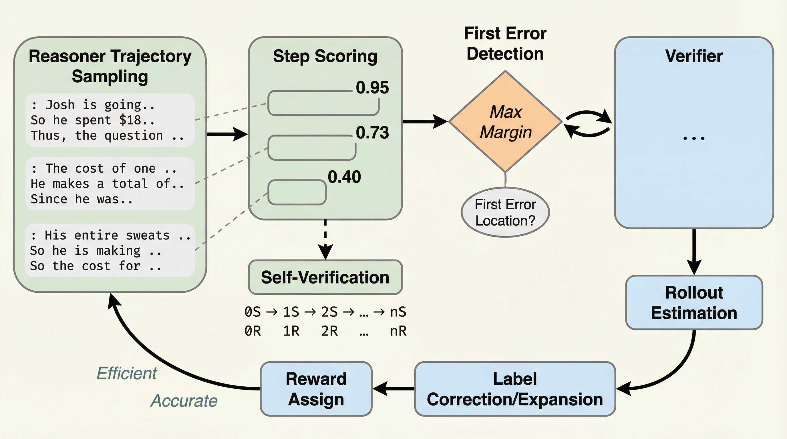 本研究では、この課題を解決するために「自己適応的なプロセス最適化(SAPO)」という新しい手法を提案している。この手法の最大の特徴は、人間が誤った判断を下した直後にそれを自発的に検知し、修正を行う「エラー関連陰性電位(ERN)」という認知心理学的なメカニズムをAIの学習に取り入れた点にある。SAPOは、すべての推論ステップを一律に検証するのではなく、エラーが発生した可能性が最も高い箇所を特定し、そこを集中的に修正することで、プロセス監視の効率を劇的に高めている。具体的には、検証器が推論ステップごとにスコアを割り当て、スコアの変化が最も大きい箇所を「最初のエラー位置」として予測する。その後、推論器自身がその特定の箇所に対してのみ少数のロールアウト(事後推定)を行い、検証器の予測が正しかったかどうかを確認する。…