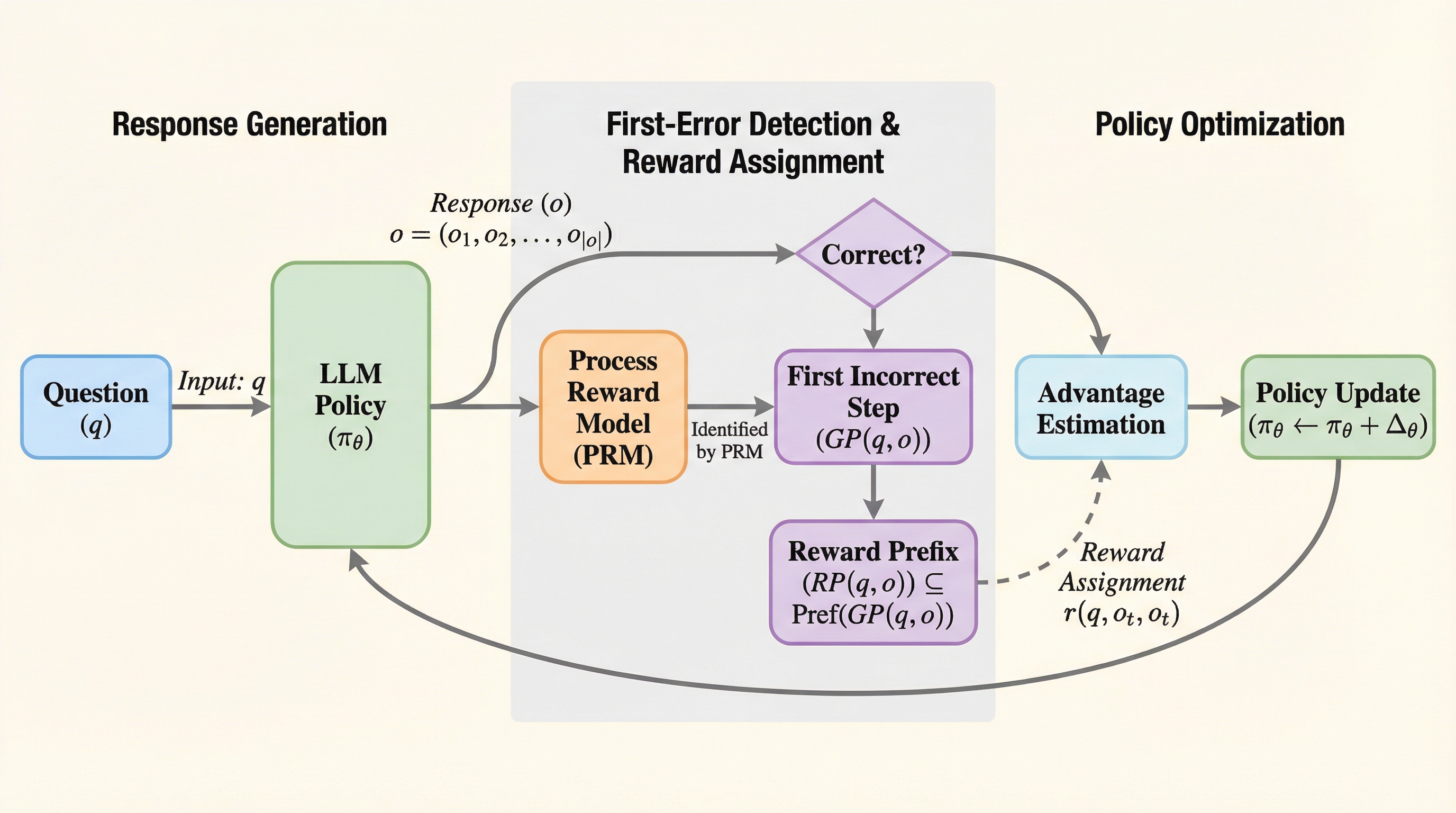 大規模言語モデル(LLM)の推論学習において、最終回答の正誤のみを報酬とする従来の強化学習では、誤答に含まれる「途中までの正しい思考(グッド・プレフィックス)」が不当に否定される課題がありました。