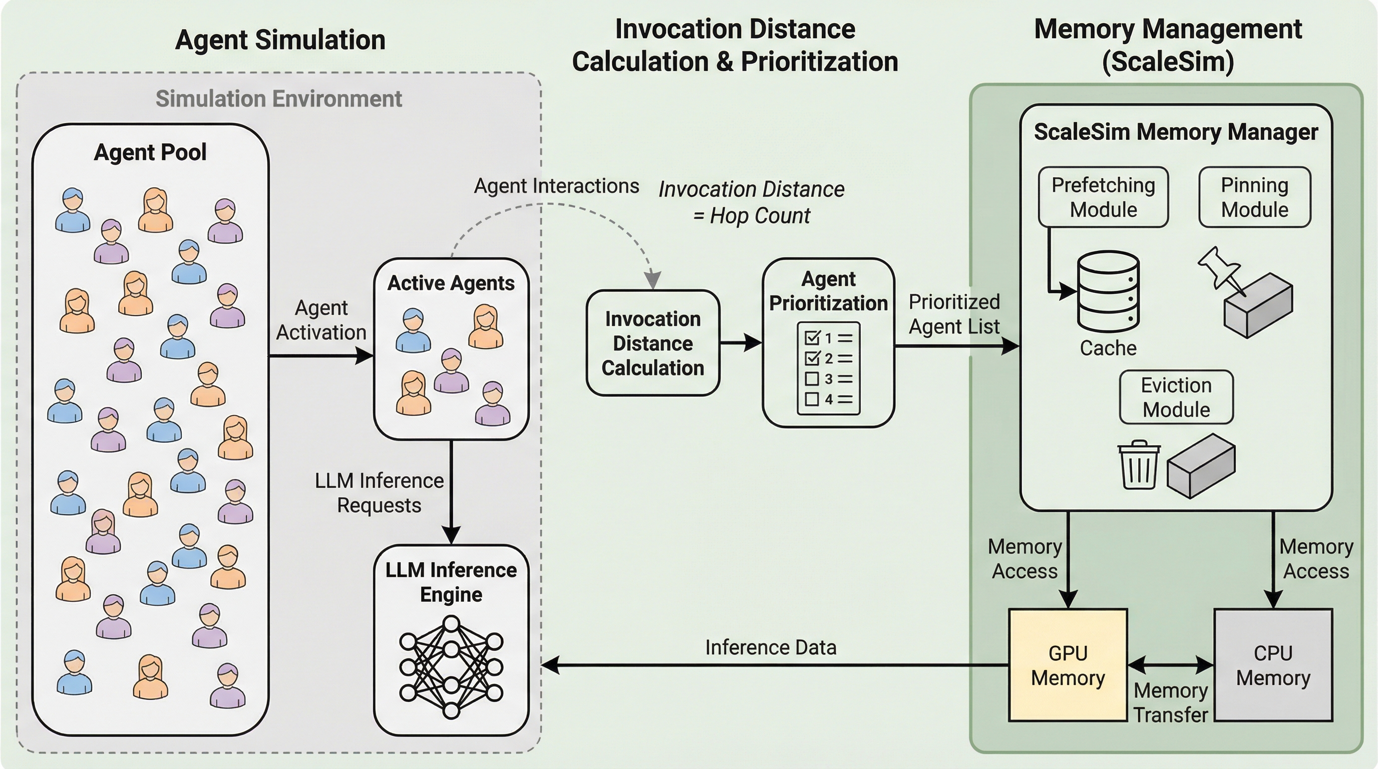 大規模言語モデルを用いたマルチエージェントシミュレーションでは、エージェント数の増加に伴い、各個体が保持するLoRAアダプタやプレフィックスキャッシュなどの膨大な専用データがGPUメモリを圧迫し、頻繁なデータ転送による遅延が深刻なボトルネックとなっている。 本研究が提案する「ScaleSim」は、エージェントが次にモデルを呼び出すまでの相対的な順序を推定する「呼び出し距離」という統一的な概念を導入し、この指標に基づいてメモリの能動的な事前読み込みや優先順位付きの破棄をインテリジェントに実行する。 この仕組みにより、エージェントの活動が時間的に疎であるという特性を最大限に活用し、既存のサービングシステムであるSGLangと比較して最大1.74倍の実行速度向上を達成し、限られた計算資源での大規模なエージェント社会の構築を可能にした。