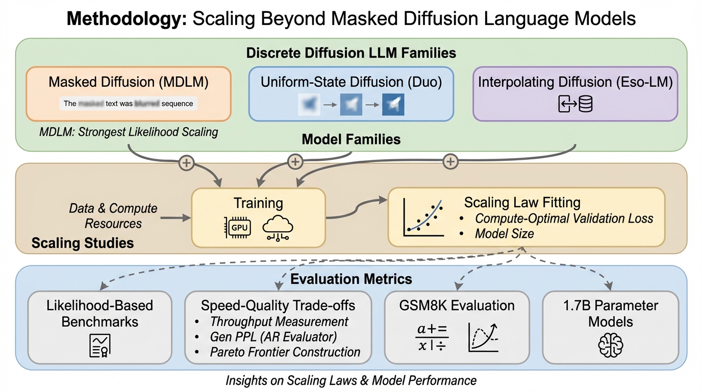 本研究の提案は大きく三つに整理できます。第一に、Uniform-state diffusionとinterpolating diffusionについて、スケーリング則の系統的な研究を初めて提示すると述べています。離散拡散の議論はMasked diffusionに寄りやすく、他の拡散ファミリーを同じ条件で大規模に調べることが手薄だった、という認識が前提にあります。そこでMasked diffusion(MDLM)、Uniform-state diffusion(Duo)、interpolating diffusion(Eso-LM)を代表として選び、計算量をそろえた条件で学習させ、検証損失や計算最適なモ…