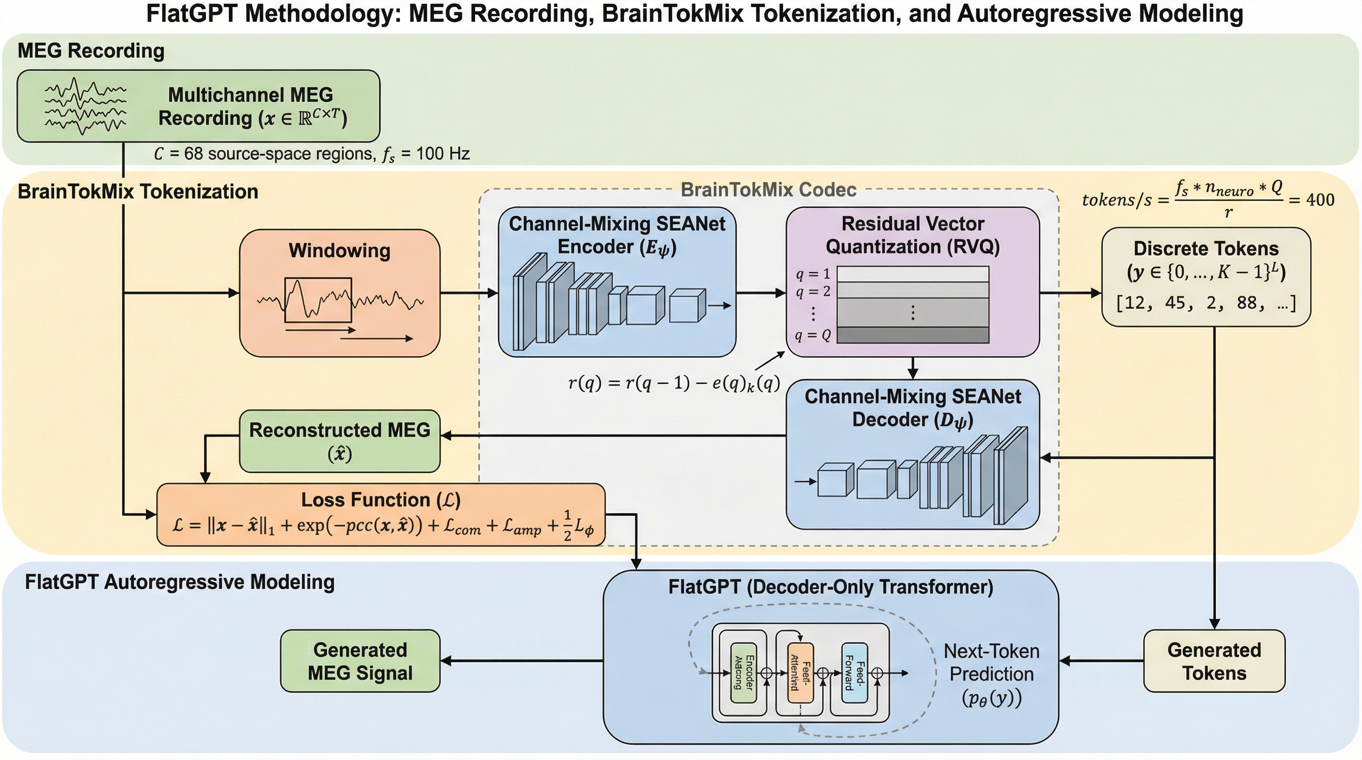 本研究は、500時間以上の大規模な脳磁図(MEG)データセットを用い、次トークン予測のパラダイムを脳信号に適用した大規模自己回帰モデル「FlatGPT」を提案しています。 多チャネルのMEG信号を「BrainTokMix」という独自のトークナイザーで離散的なトークン列に変換し、Qwen2.