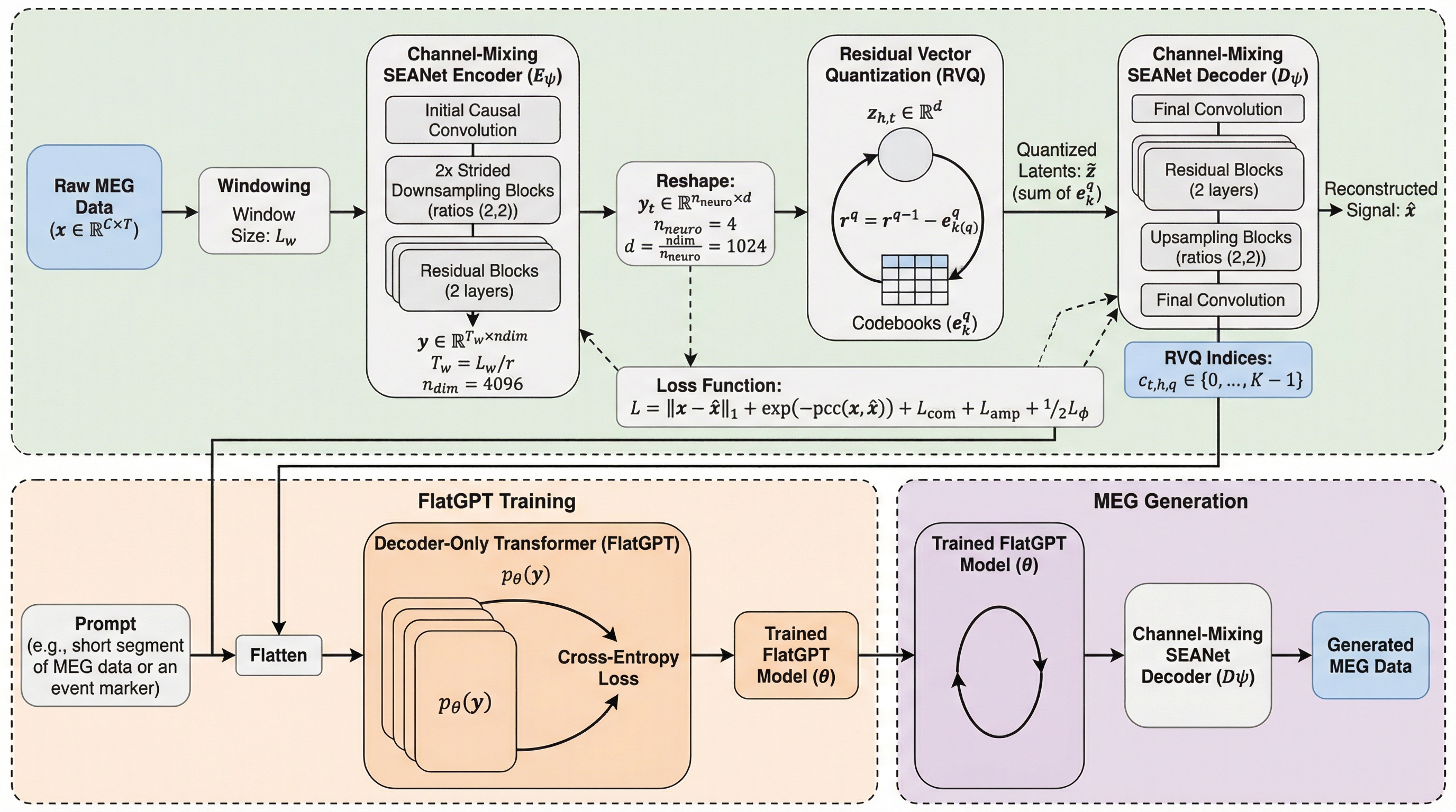本研究では、500時間以上の大規模なMEG(磁気脳鳴図)データセットであるCamCAN、Omega、MOUSを統合し、多チャネルの脳信号を離散的なトークン列として予測する大規模自己回帰モデル「FlatGPT」を構築した。
