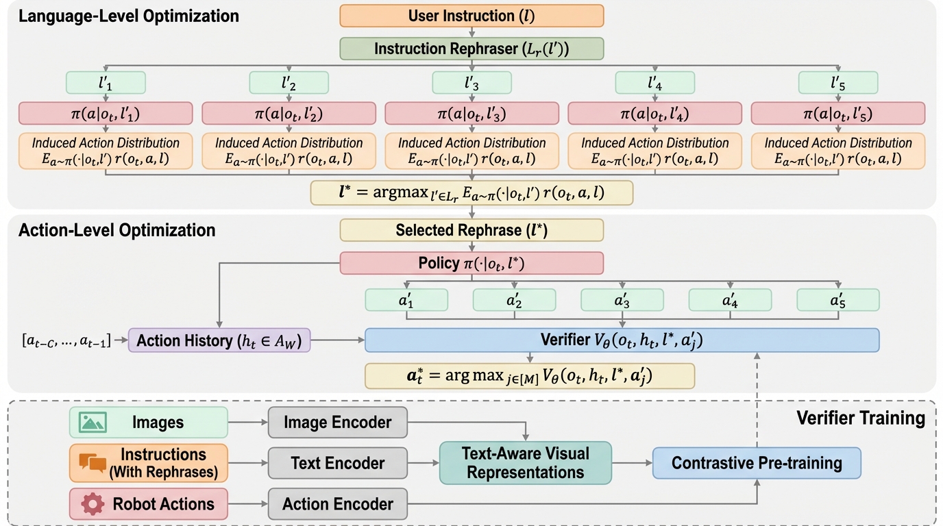 本論文では、VLAモデルの整合性を向上させるために、ポリシー学習をスケールさせるよりも「テスト時の検証(Verification)」をスケールさせる方が、計算効率と性能の両面で優れているという新たな視点を提案しました。この核心となる提案が、対照学習を用いた検証器「CoVer(Contrastive Verifier)」と、それを利用した階層的なテスト時検証パイプラインです。このフレームワークは、ロボットが推論時(テスト時)に追加の計算資源を投入し、生成された行動と指示の整合性を自ら評価・選択できるようにするものです。 提案手法の大きな特徴の一つは、「ブートタイム計算(boot-time compute)」という概念の導入です。これは、ロボットが実際の動作を開始する前の待機時間に、VLMを用いてシーン内のオブジェクトや空間関係を詳細に推論し、元の指示を意味的に等価な複数の表現に言い換えておくプロセスです。…