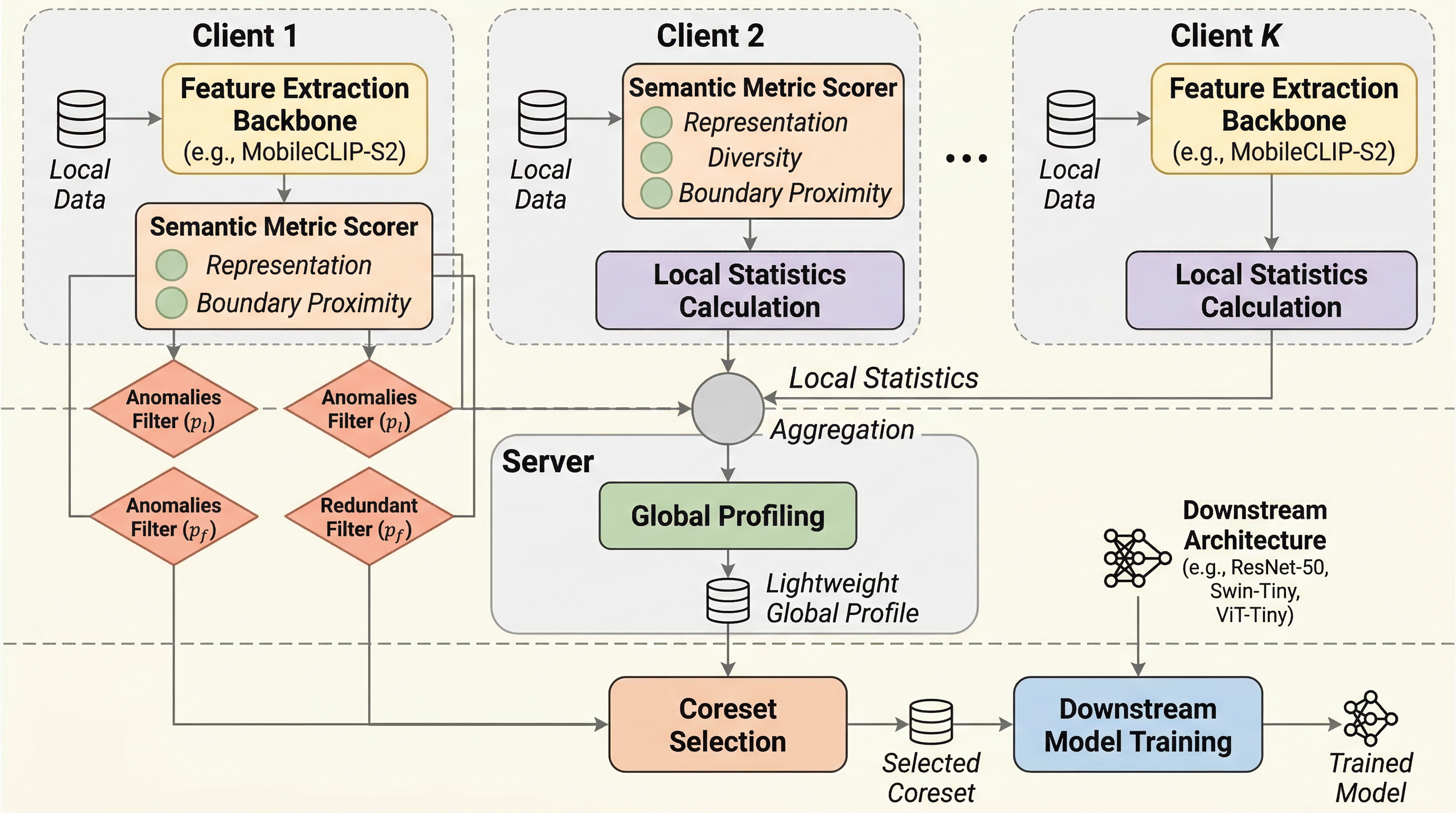 科学データの連合学習では、データを中央集約できないだけでなく、クライアントごとに極端なクラス不均衡や長い尾を引く分布があり、素朴なコアセット選択がむしろ希少な重要サンプルを落としてしまいます。SCOPE はこの問題を「各点の意味的な役割を見て残す」方向から組み替えました。 中核は、共有の表現空間で各サンプルに代表性・多様性・境界近接度という三つの尺度を与え、各クライアントが送るのは特徴ベクトルではなく軽量な数値指標だけにすることです。サーバはそれを集約して全体合意を作り、各クライアントはその合意に沿って異常点を落とし、希少だが大事な境界サンプルを残します。 実験では CIFAR-10、CIFAR-100、Tiny-ImageNet、UHCS で、SCOPE が 128倍から512倍の上り通信削減、7.72倍の実時間短縮、FLOP/VRAM 削減を達成しつつ、極端な偏り条件で既存法より高い精度と安定した収束を示しました。特に全データ利用より高精度になる条件がある点が面白く、「全部残す」こと自体がノイズになる場面を定量化しています。