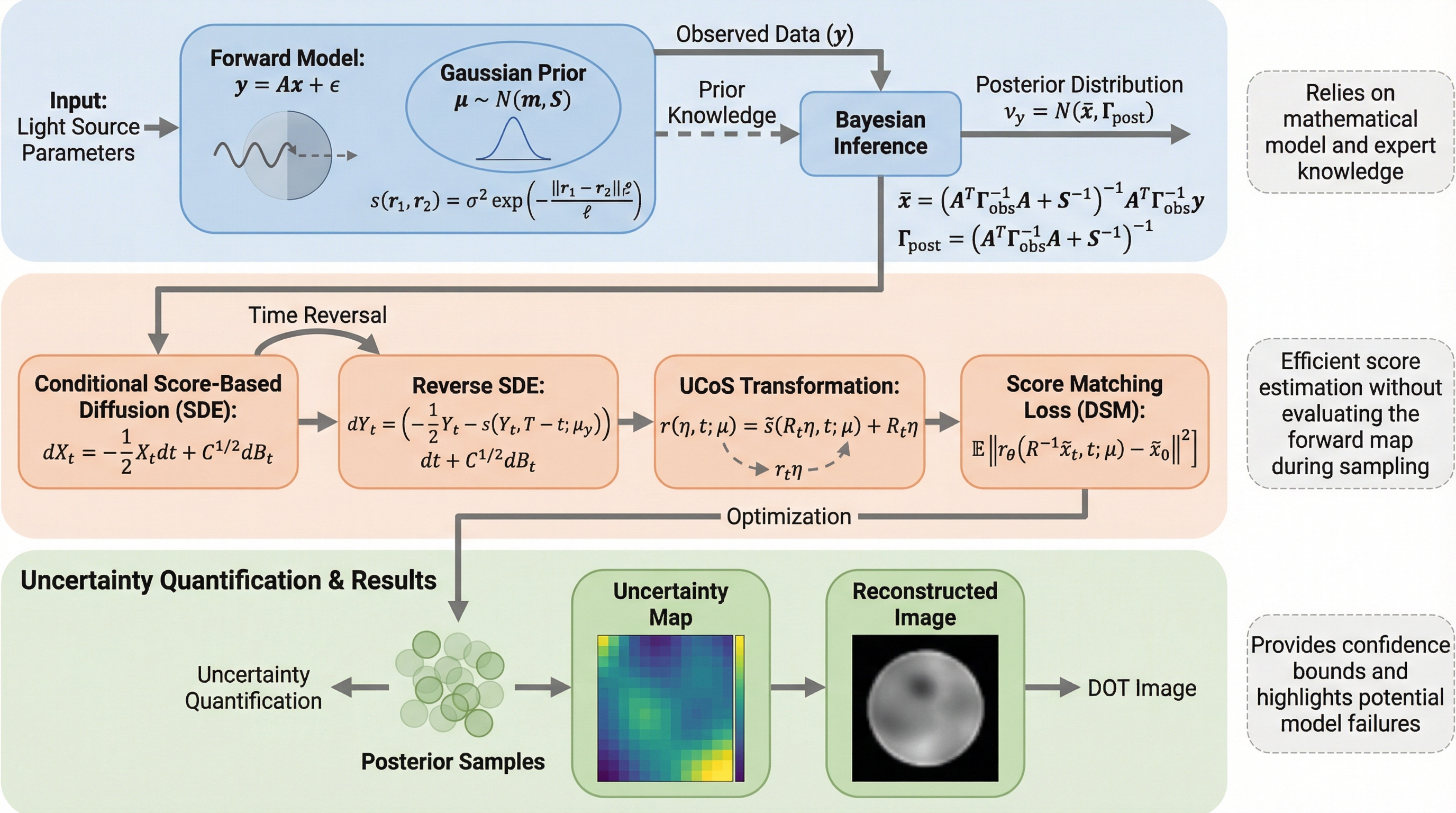 拡散光トモグラフィ(DOT)における高度な不良設定性とモデル誤差の課題に対し、スコアベース拡散モデルを用いた新しい事後サンプリング枠組みであるUCoSを適用した。 学習済みのデータ駆動型スコアと物理モデルに基づくガウス型スコアを凸結合させる新しい正則化手法を提案し、限定的な観測条件や分布外データに対する推定のロバスト性を向上させた。 シミュレーションおよび実測データを用いた検証により、従来手法よりも事後分散を大幅に抑制し、ターゲット周辺に不確実性を局在化させた信頼性の高い画像再構成と不確実性定量化を実現した。