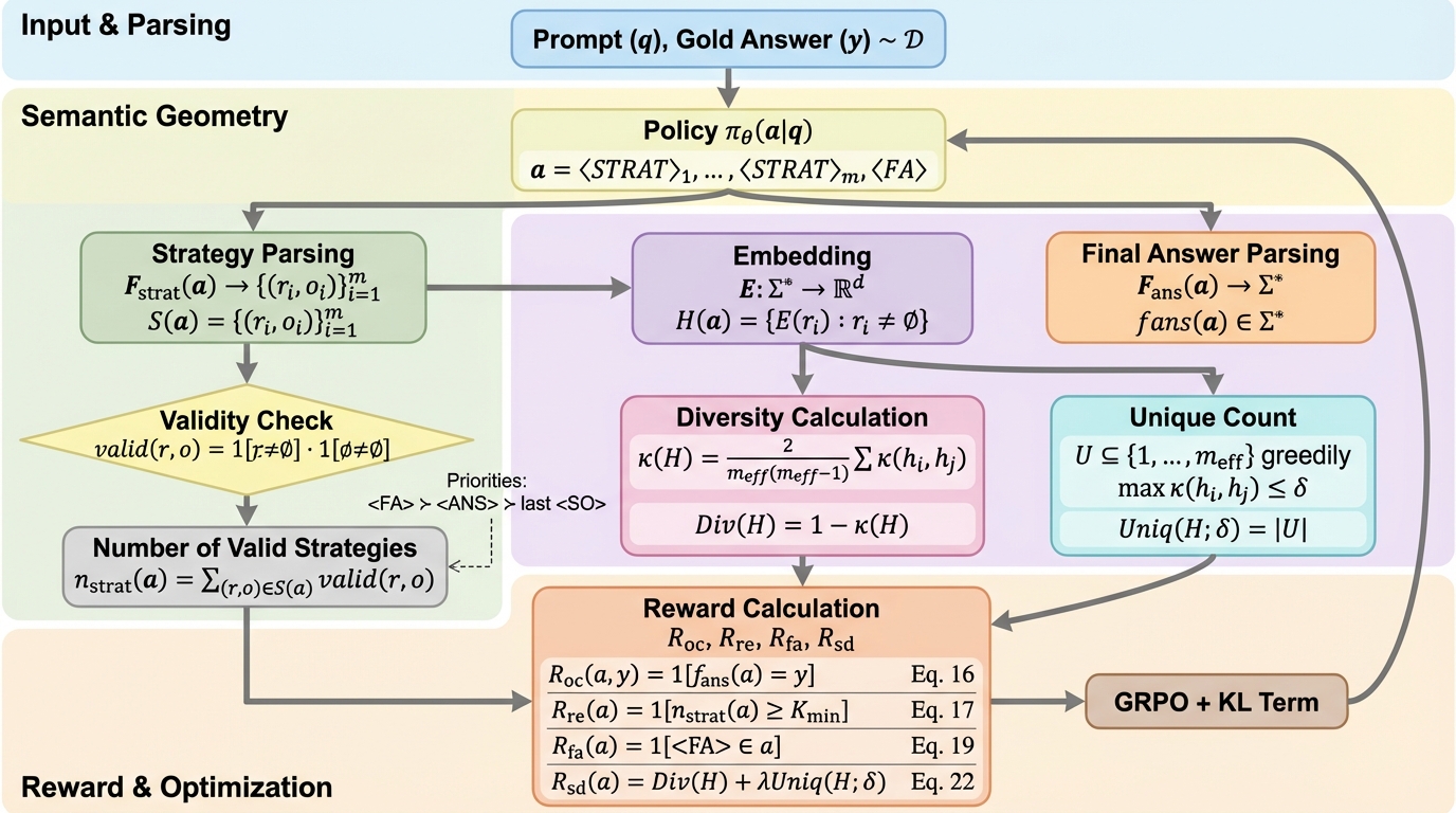本研究が提案する「SD-E$^2$(Semantic Diversity – Exploration–Exploitation)」は、意味的な多様性を明示的に報酬化する革新的な強化学習フレームワークです。この手法の核心は、固定された文埋め込みモデル(sentence-embedding model)を活用して、生成された推論プロセスの「意味的な広がり」と「戦略の重複度」を幾何学的に測定することにあります。SD-E$^2$は、モデルが新しい戦略を探索している間、それが既存の試行と意味的に異なれば報酬を与え、逆に似通った内容であれば報酬を抑制します。そして、一度でも正しい解法(戦略)が見つかると、探索から「活用」へと報酬の比重を切り替え、成功した経路を定着させるボーナスを付与します。これを著者らは「認知的適応(cognitive adaptation)」と呼んでいます。…