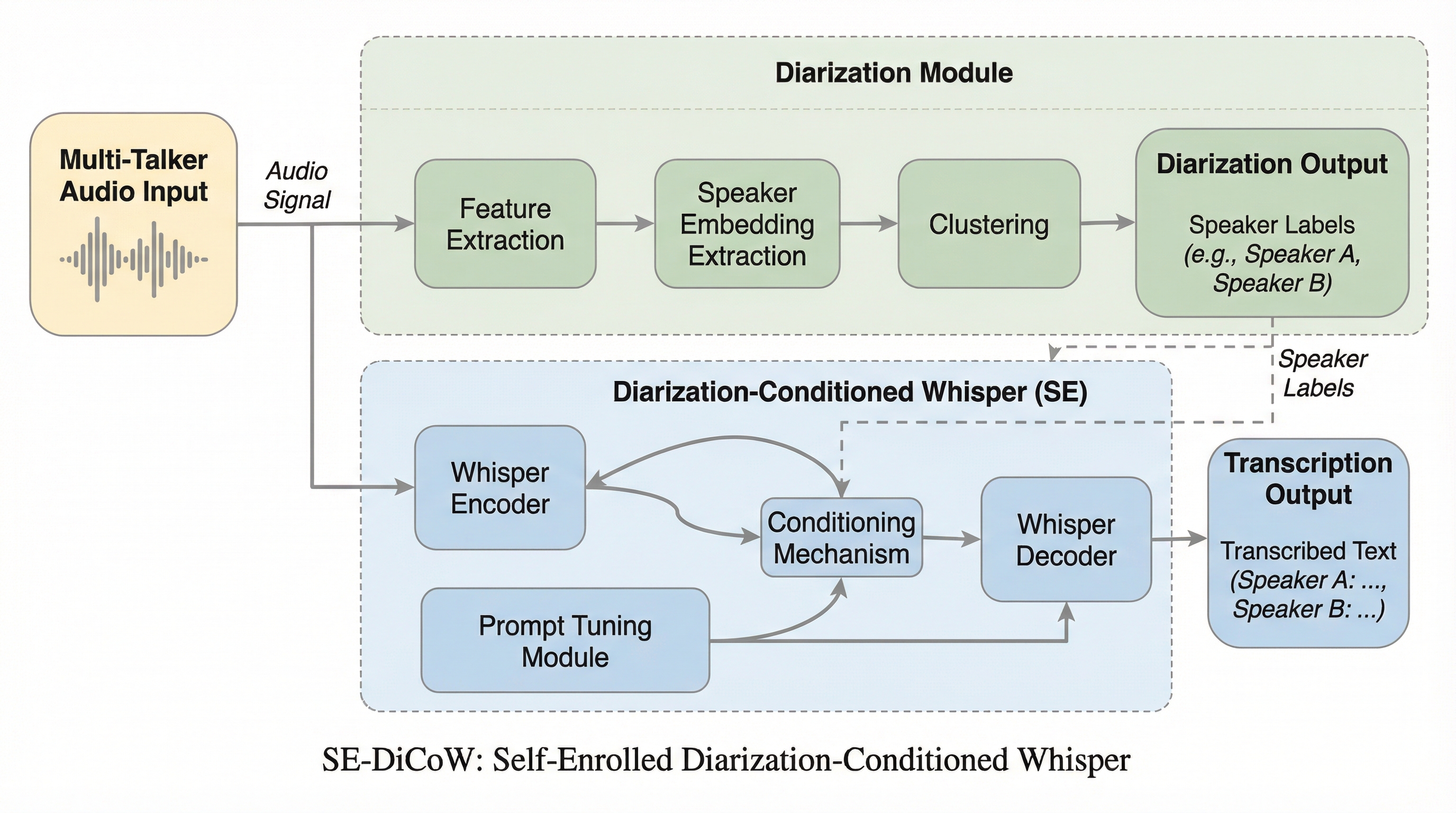 本論文では、DiCoWの主要な限界を克服するために、自己登録型ダイアライゼーション条件付きWhisperである「SE-DiCoW(Self-Enrolled Diarization-Conditioned Whisper)」を提案します。この手法の核心は、外部から事前に用意された話者の登録音声(エンロールメント)を必要とせず、処理対象の会話そのものの中から最適な参照区間を自動的に見つけ出し、それを条件付け情報として利用する「自己登録メカニズム」にあります。 具体的には、ダイアライゼーションの出力を用いて、会話内のどこからでも対象話者が最も活発に話している(他の話者の干渉が少ない、あるいは対象話者の特徴が明確な)区間を「登録セグメント」として特定します。このセグメントは、エンコーダーの各層においてクロスアテンション機構を介し、固定された条件付け情報としてモデルに注入されます。…