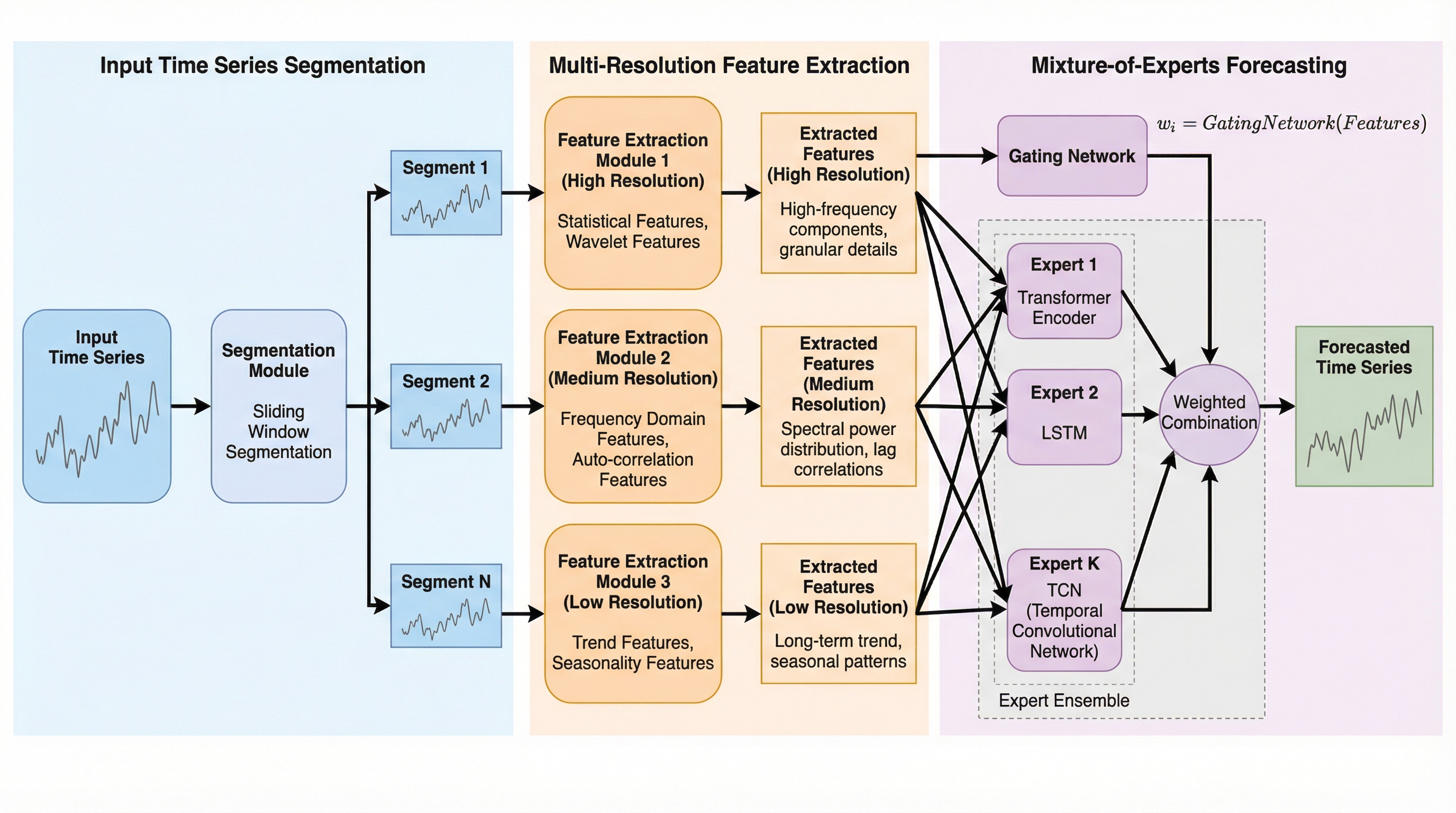 本研究では、時系列データの局所性と時間的文脈を最大限に活用するための新しいMoE設計である「Seg-MoE」を提案している。Seg-MoEの核心的なアイデアは、従来のトークン単位のルーティングから、連続するタイムステップをまとめたセグメント単位のルーティングへと転換した点にある。具体的には、入力シーケンスを重複のない連続したセグメントに再構成し、それらを一つのユニットとして専門家に割り当てる仕組みを導入した。これにより、各専門家はセグメント内の相互作用を直接モデル化できるようになり、時系列データが持つ固有のパターンに自然に適合させることが可能となる。 この設計は、時系列のパターンがしばしば局所的で構成的であるという強力な帰納バイアスに基づいている。…