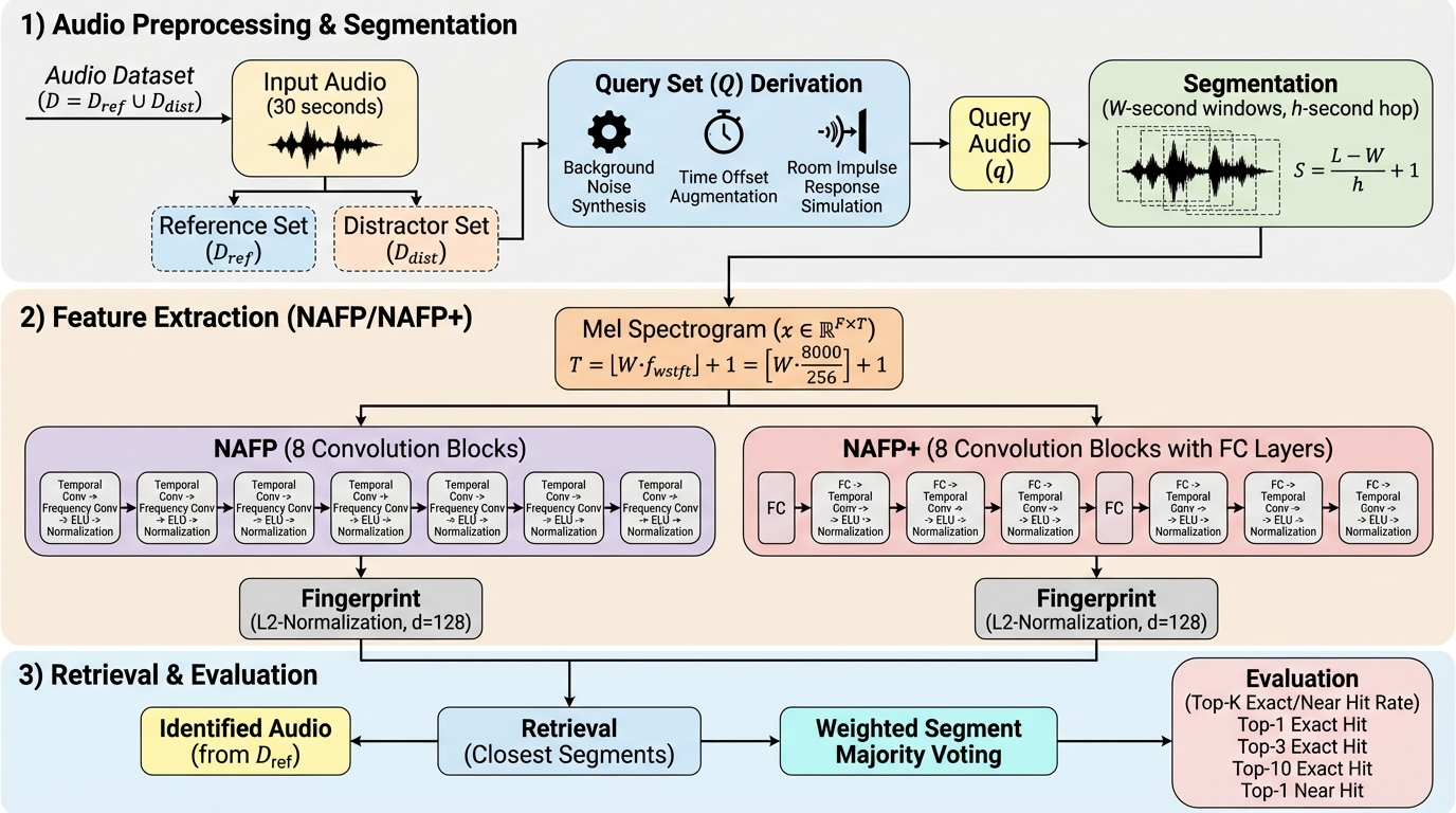 本研究では、既存のニューラル音声指紋照合モデルであるNAFP(Neural Audio FingerPrinter)をベースに、異なるセグメント長に適応可能なモデルのバリアントとして「NAFP+」を提案しました。従来のNAFPは、学習段階とクエリ段階の両方で1秒のセグメンテーションを適用することを前提として設計されています。これに対し、提案されたNAFP+は、0.5秒、1秒、2秒といった多様なセグメント長(W)を柔軟に扱えるように設計変更が加えられています。具体的には、NAFPの畳み込みブロックの構成を大きく変えることなく、各ブロックの前にELU活性化関数を備えた全結合層を追加するという修正を行っています。 この全結合層の追加により、入力される音声フレーム数(T)がセグメント長によって異なる場合でも、それを固定された数(T0=32)に正規化して後続の処理に渡すことが可能になりました。…