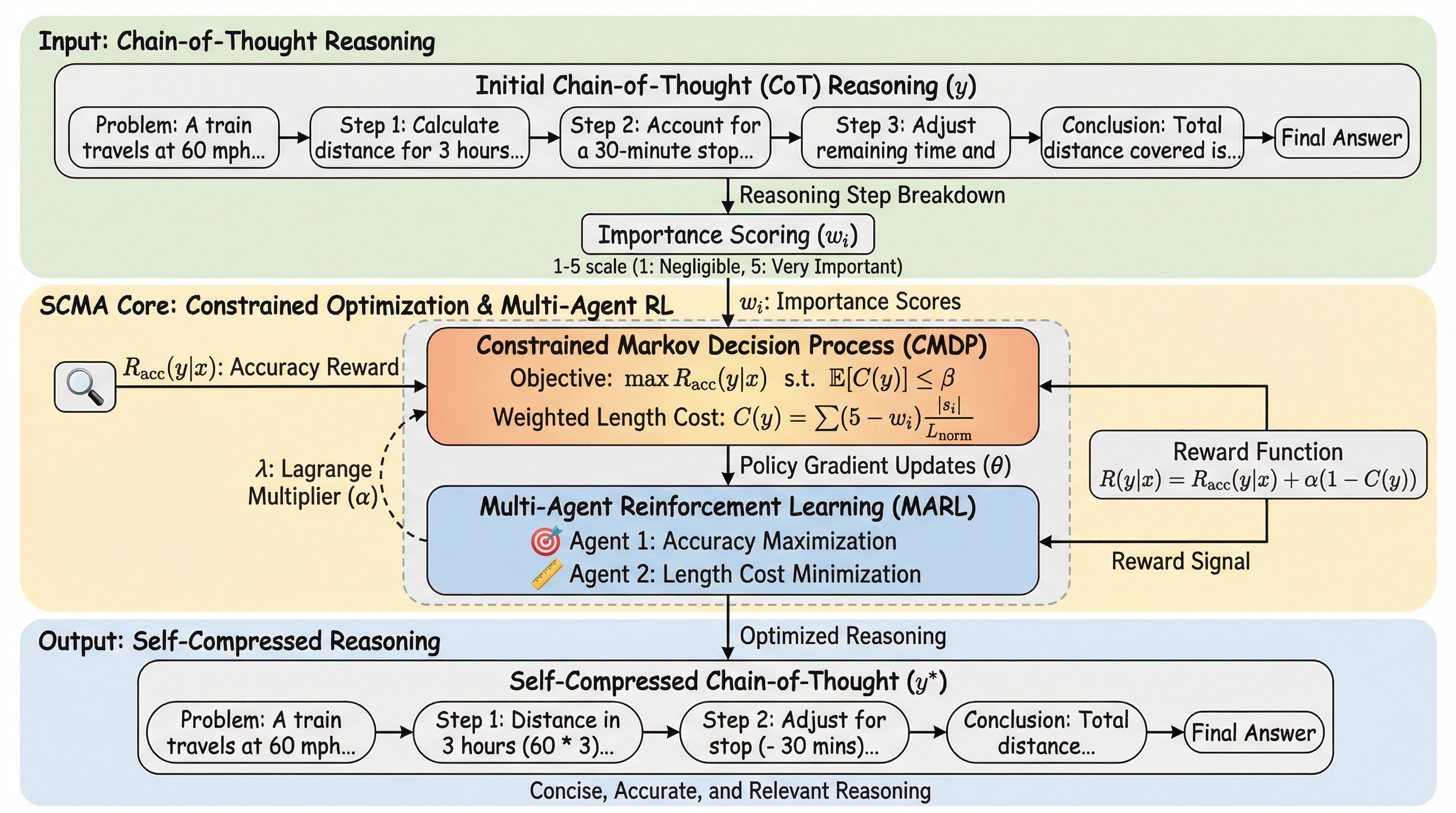 大規模推論モデル(LRM)における冗長な思考プロセスが引き起こす推論コストの増大と、従来の長さペナルティ手法が抱える「簡潔さと正確性のトレードオフ」を解決するため、マルチエージェント強化学習(MARL)を用いた自己圧縮フレームワーク「SCMA」が提案されました。