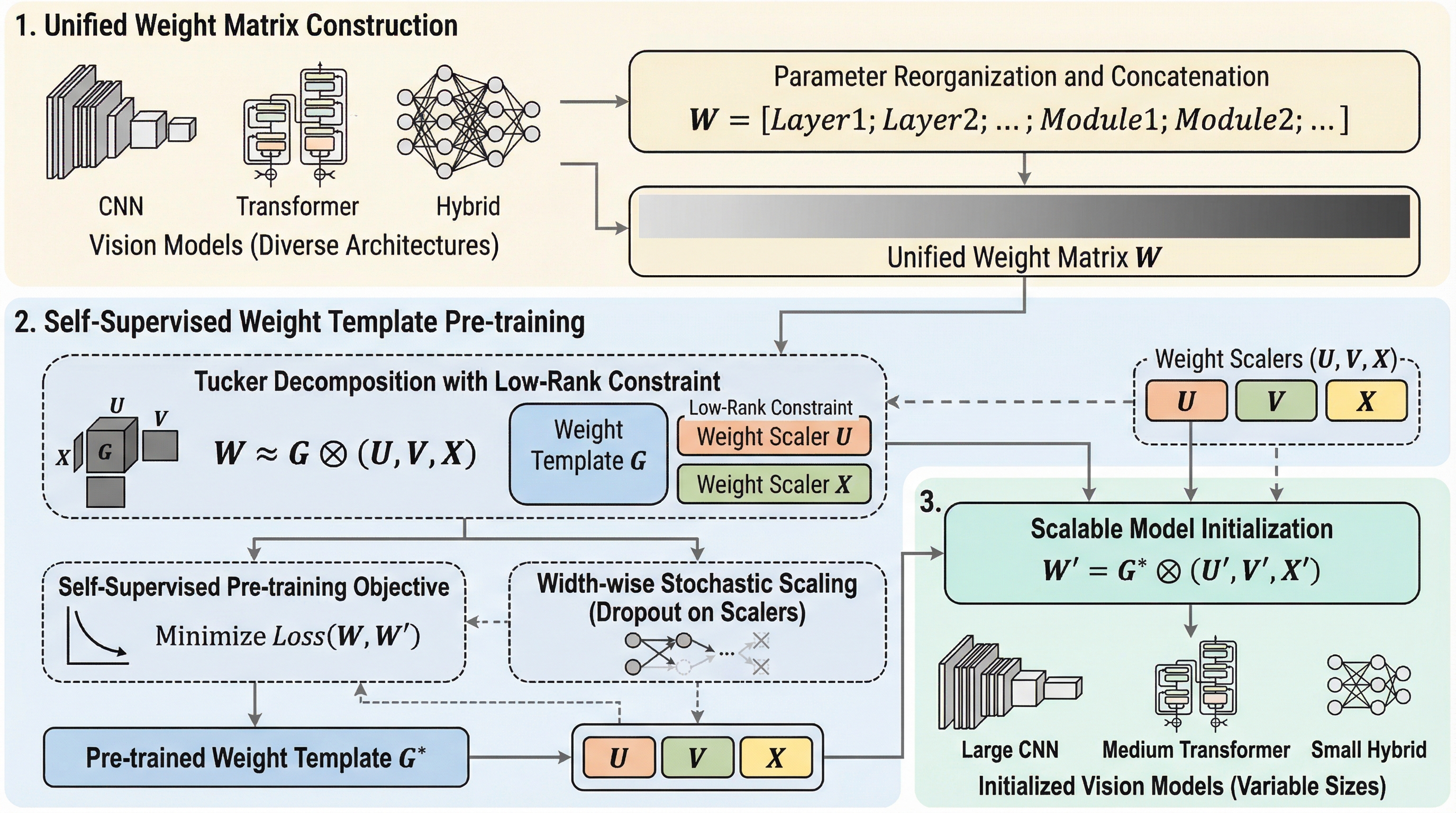 現代の視覚モデルの急速な大規模化に伴い、特定のサイズで事前学習されたモデルを異なる規模のアーキテクチャに適応させる際の膨大な計算コストが課題となっているが、本研究はこの問題を解決するために、Tucker分解に基づく構造的制約を用いた自己教師あり学習フレームワークであるSWEETを提案した。 この手法は、モデル内の全パラメータを統合した巨大な行列を、共有の「重みテンプレート」とサイズ固有の「重みスケーラー」に分解して学習することで、深さや幅が異なる多様なモデルへの柔軟な初期化を可能にし、さらに幅方向の確率的スケーリングを導入することで、任意のモデル幅に対する頑健な転送性能を実現している。 画像分類、物体検出、セマンティックセグメンテーション、画像生成の各タスクにおいて、従来の固定サイズモデルや既存の初期化手法を大幅に上回る性能を実証しており、一度の事前学習で得られたテンプレートを軽量なスケーラー適応のみで再利用できるため、計算リソースを抑えた効率的なモデル展開の新たな基準を確立した。