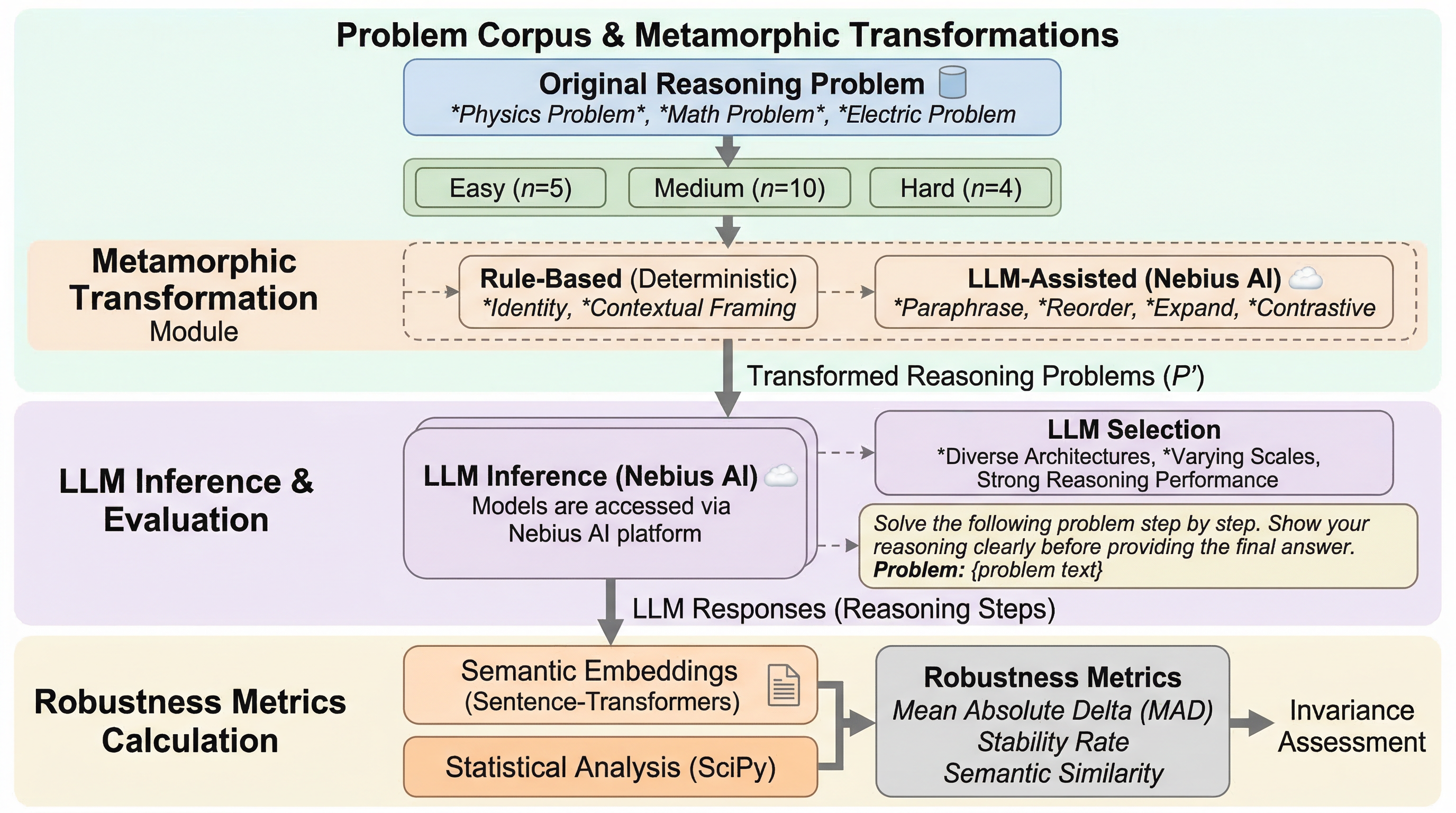 本論文の中心的な提案は、エージェント型大規模言語モデルに対して「意味不変性」を評価する包括的な枠組みを導入したことです。意味不変性とは、入力表現が変わっても、その変化が意味を保つものである限り、モデルの推論や応答も本質的に一貫していてほしい、という考え方です。この性質を定量的に見るために、著者らはソフトウェア検証で知られる変成的テストを、言語モデルの推論評価へと持ち込みました。