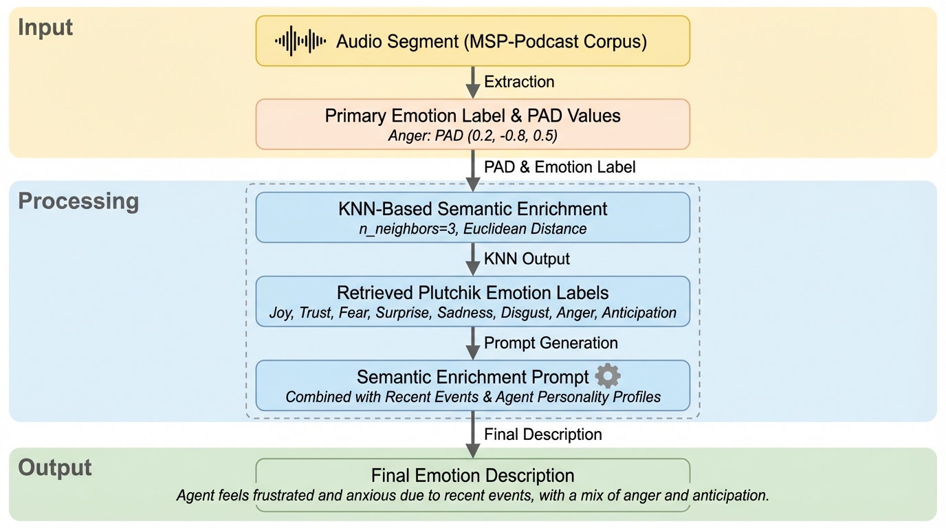 本研究は、エージェントが長期的な感情の持続性を保持できるように設計された新しいアーキテクチャ「SENTIPOLIS」を提案しました。このフレームワークの最大の特徴は、感情を一時的な変数ではなく、エージェントの内部に常に存在する「持続的な状態」として定義した点にあります。具体的には、心理学的なモデルであるPAD(Pleasure-Arousal-Dominance)空間を用いた連続的な感情表現を採用し、エージェントが常にこの空間上の座標として感情を保持するようにしました。SENTIPOLISのアーキテクチャは、主に3つの柱で構成されています。第一に、PADモデルによる感情の数値化と、それが時間とともに自然に減衰していく仕組みの導入です。…