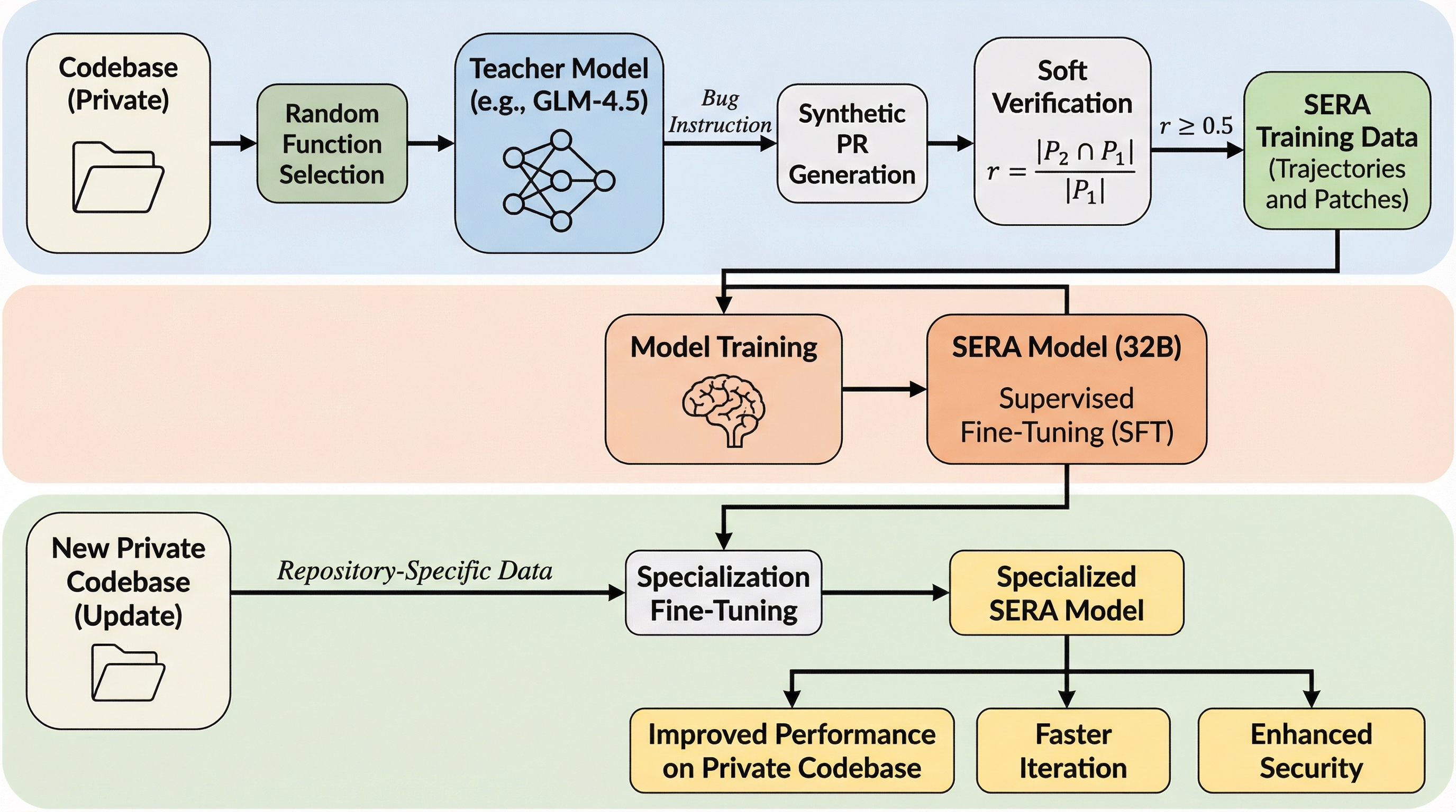 SERAは、プライベートなコードベースに特化可能なオープンソースのコーディングエージェントであり、従来の強化学習より26倍、既存の合成データ手法より57倍も安価に訓練できる手法を提案しています。