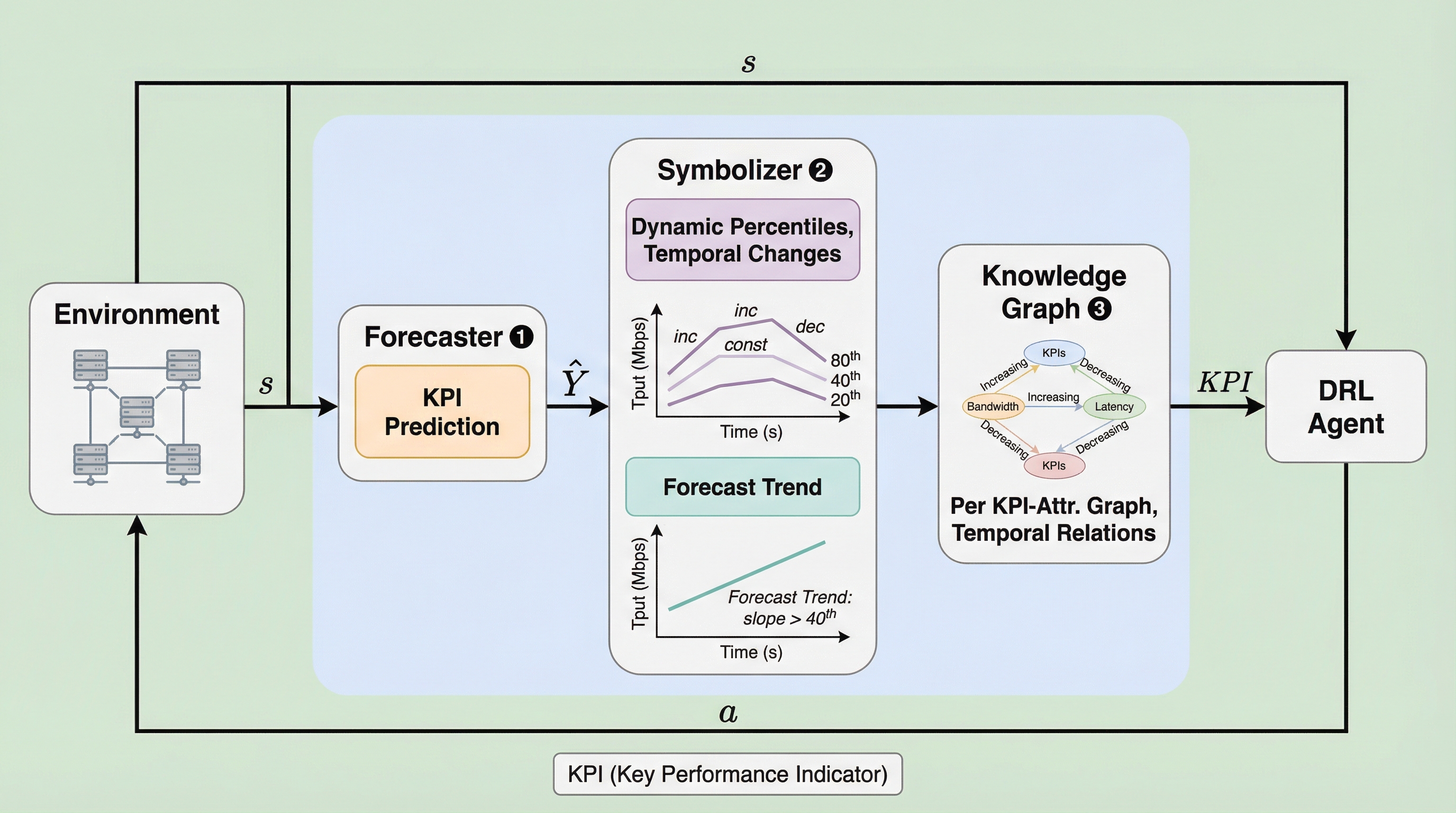 SIAは、予測情報を活用する深層強化学習(DRL)エージェントの意思決定プロセスをリアルタイムで可視化し、人間が理解可能な形式で解釈可能にする新しいフレームワークである。記号的AIの抽象化概念とKPIごとの独立した知識グラフを融合することで、現在の観測データと将来の予測データが行動に与える影響を個別に分離して評価する「影響スコア(IS)」を導入し、既存手法より200倍以上の高速化を達成した。ビデオストリーミングやRANスライシングなどの検証において、エージェントの設計ミスを特定してビットレートを9%向上させ、さらに再学習なしで報酬を25%改善することに成功し、予測型制御の信頼性と性能を大幅に高めている。