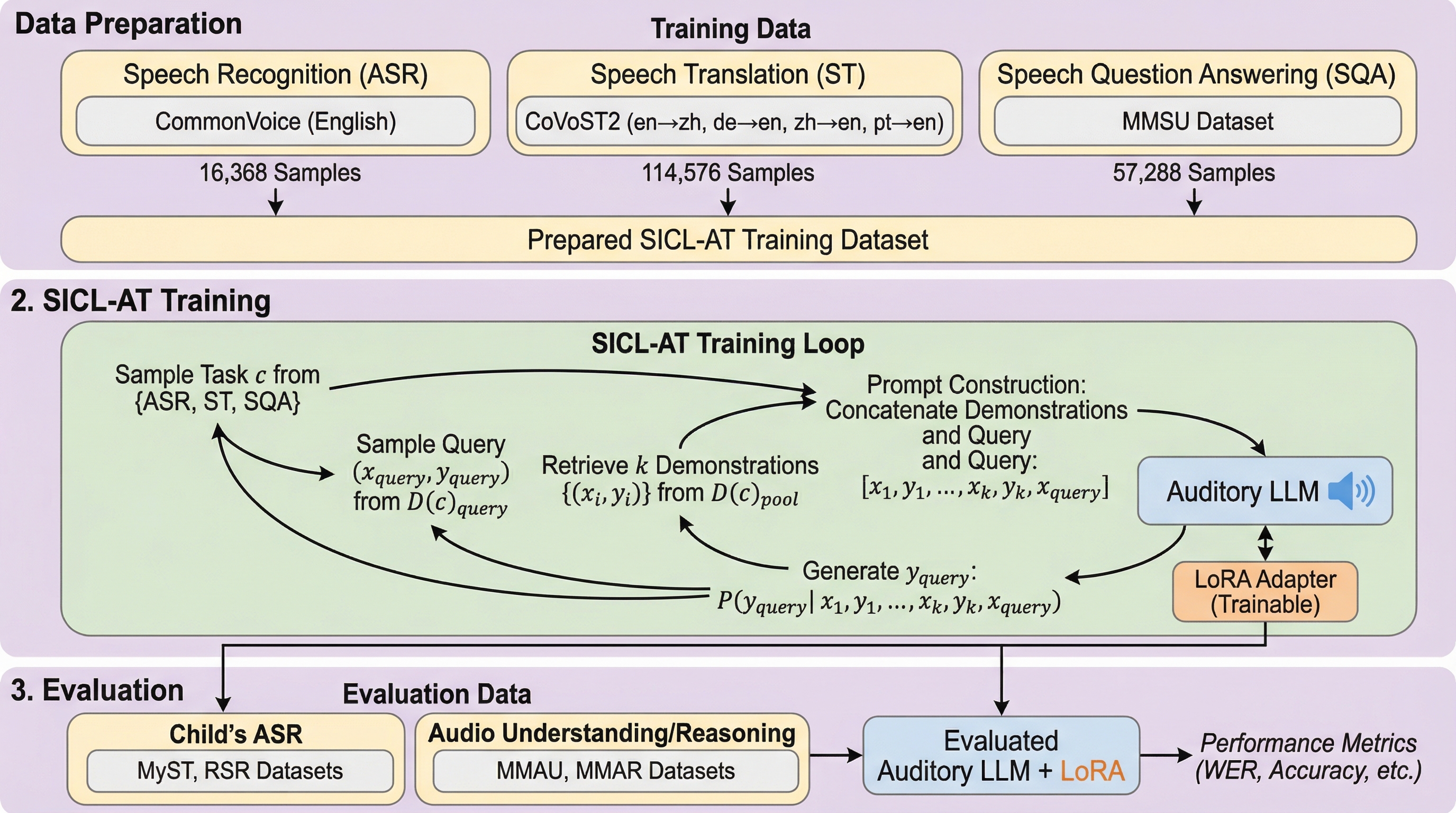 本研究では、聴覚LLMのインコンテキスト学習能力を根本から強化するための新しい事後学習戦略として、「Speech In-Context Learning Adaptation-Tuning(SICL-AT)」を提案しています。この手法の核心は、モデルに対して特定のドメイン知識を教え込むことではなく、推論時に提供されるオーディオのデモンストレーション(例示)を条件として、適切な回答を生成する「能力そのもの」を訓練することにあります。具体的には、豊富な高リソース音声データを利用して、推論時と全く同じエピソード形式のフォーマットでモデルを学習させることで、未知のタスクや低リソースな設定においても、少数の例示から柔軟に適応できるインテリジェンスを養います。…