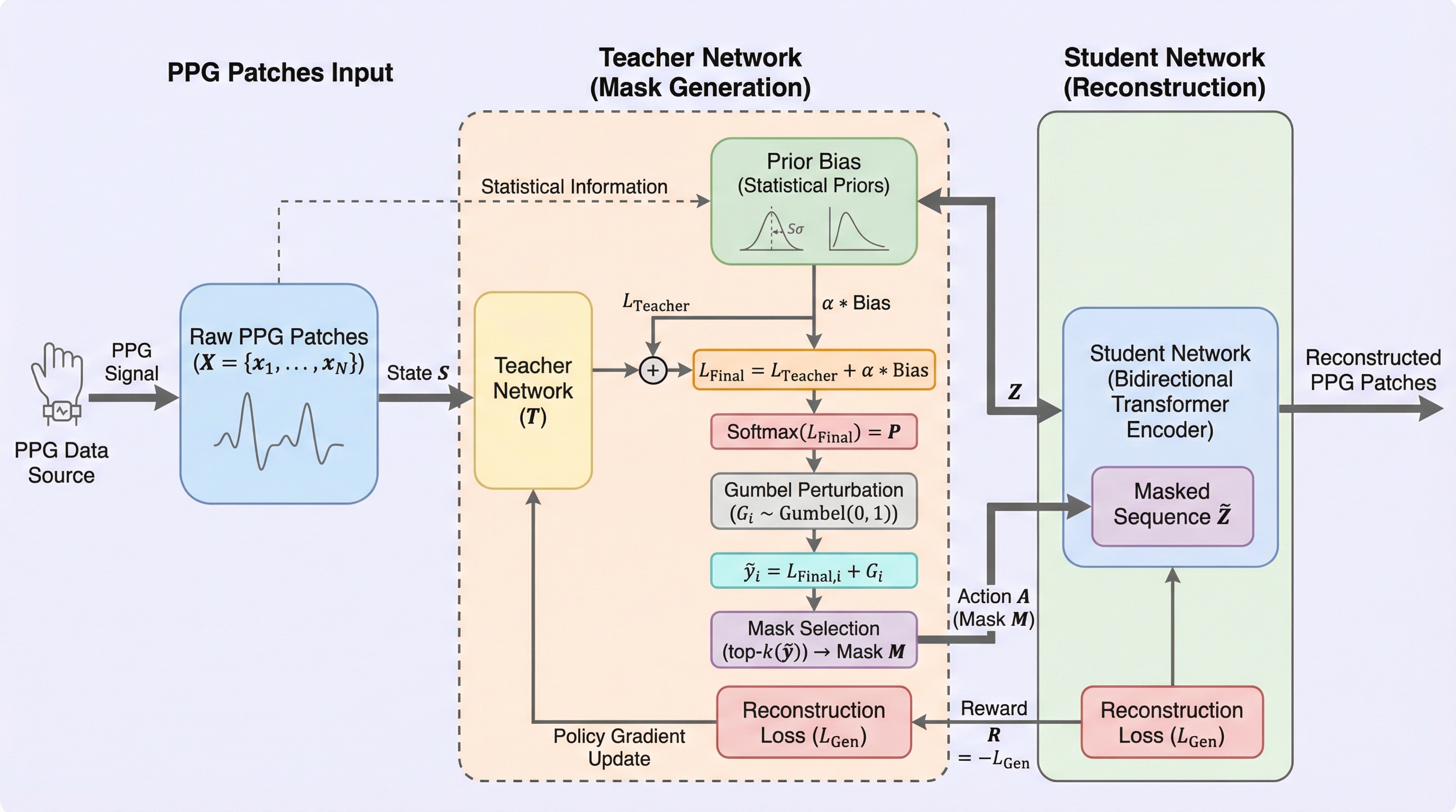 光電容積脈波(PPG)信号の解析において、従来のランダムマスキングが信号の周期性ゆえに容易に解けてしまう問題と、対照学習が微細な形態的特徴を軽視する課題を解決するため、統計的事前情報を導入した生成型基盤モデル「SIGMA-PPG」が提案されました。 このモデルは、強化学習を用いた教師ネットワークが振幅の安定性や波形の歪度といった統計的指標に基づき、学生ネットワークに対して生理学的に重要な部位を優先的に隠す「事前情報ガイド付き敵対的マスキング」を動的に生成することで、ノイズへの過学習を防ぎます。 12万時間以上の大規模データで事前学習されたこのモデルは、心拍数や血圧の推定、感情認識、個人識別など12種類の多様な下流タスクにおいて、既存の5つの最先端モデルを上回る平均性能を達成し、ウェアラブルデバイス等での高度な健康モニタリングへの応用が期待されます。