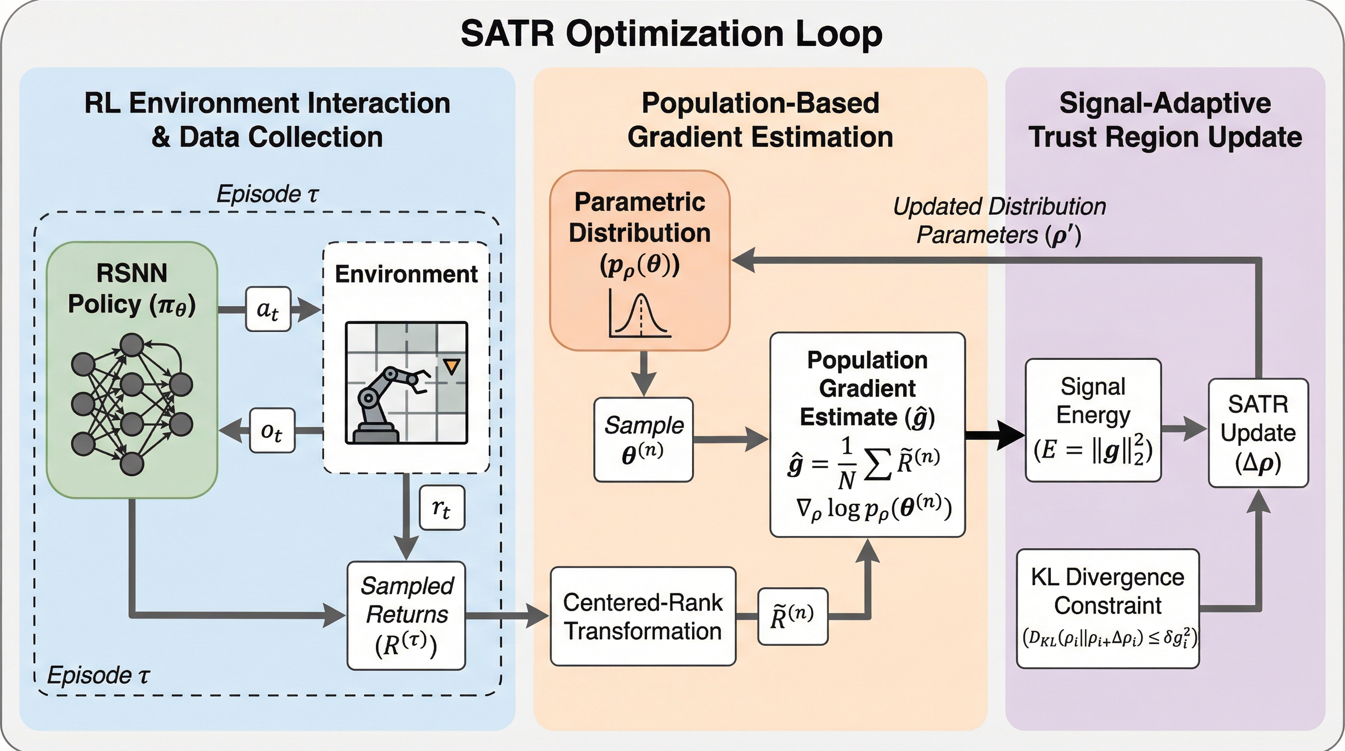 1. 再帰型スパイキングニューラルネットワーク(RSNN)の強化学習において、個体群ベースの勾配推定に伴うノイズと不安定さを解消するため、推定された信号エネルギーに基づいて更新幅(KLダイバージェンス)を動的に調整する「信号適応型信頼領域法(SATR)」を開発した。 2.
