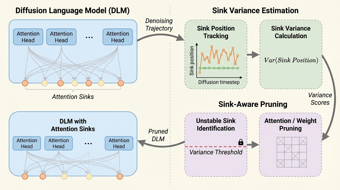 本研究の中心は、「DLMsではsinkの位置が生成過程を通じて大きく揺れる」という観察を、定量指標として押さえたうえで剪定戦略に落とし込む点にあります。Abstractでは、ARのsinkが安定したグローバルな錨として機能するため従来は保護されてきた一方で、DLMsでは生成軌跡全体でsink位置の分散が大きく、sinkがしばしば一時的(transient)で構造的に必須とは限らない、と述べられています。この「分散」は、支配的なsinkの位置がタイムステップ間でどれだけ移動するかを測ることで評価されます。 この前提転換に基づき提案されるのがSink-Aware Pruningです。…