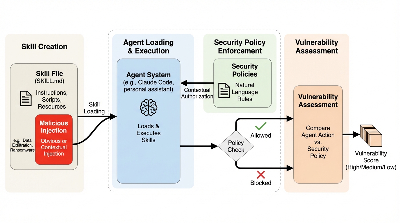 エージェントのスキル機能は外部のコードや手順を取り込んで能力を広げますが、その「指示の塊」自体に悪性の指示が混ざると、ユーザーが気づきにくいまま乗っ取りが起き得ます。 / 著者らは、スキルファイル内に埋め込まれた露骨に危険な指示と、文脈次第で正当にも見える二面性のある指示を、実タスクと組にして評価するSkillInjectを整備し、安全性と有用性を同時に測れるようにしました。 / 評価の結果、現在のエージェントは高い割合で注入指示を実行してしまい、データの持ち出しや破壊的操作、ランサムウェアに似た振る舞いまで起こり得るため、単純な入力フィルタやモデルの大型化ではなく文脈を踏まえた認可の枠組みが重要だと示唆されました。