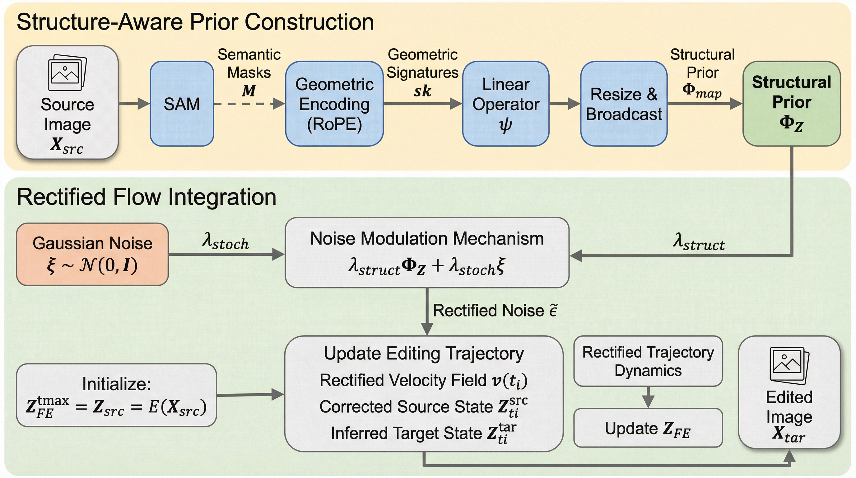 近年のStable Diffusion 3やFLUXなどのフローベース生成モデルを用いた画像編集において、既存の「反転不要(Inversion-Free)」な手法は、ソース画像の軌跡構築に固定ガウスノイズを使用するため、実際の画像分布との間に「構造的・確率的不一致」が生じ、編集過程での軌跡のズレや背景の崩れといった構造劣化を招くという課題があった。 この問題を解決するために提案された「SNR-Edit」は、セグメンテーションモデル(SAM2)と幾何学的エンコーディング(RoPE)を用いて画像固有の構造的制約を初期ノイズに注入する「構造認識型ノイズ整流」機構を導入したトレーニング不要のフレームワークであり、確率的なノイズ成分を実際の画像の潜在的な位置に固定することで編集軌跡の漂流を抑制するものである。 PIE-Benchおよび新たに構築されたSNR-Benchを用いたSD3とFLUX上での評価において、SNR-Editは既存のFlowEditやDNAEditと比較してPSNRやSSIMなどのピクセルレベル指標およびVLMベースのスコアで優れた性能を示し、画像1枚あたり約1秒の追加コストで非編集領域の構造を忠実に保持しながらテキスト指示に忠実な編集を実現したことが実証された。
