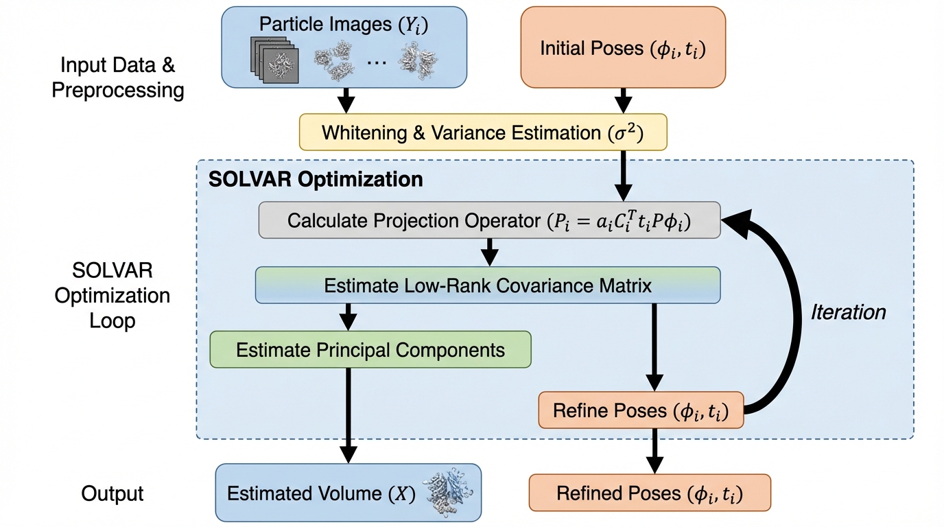 クライオ電子顕微鏡(cryo-EM)で分子が連続的に形を変えるとき、構造変動を共分散で捉える考え方は筋がよい一方、共分散行列が巨大すぎて主成分を実用的に推定しにくいという計算上の壁があります。 / SOLVARは共分散が低ランクという仮定を置き、共分散そのものではなく主成分(固有ベクトルに対応する基底体積)を目的変数にした最適化へ組み替え、確率的勾配法で素早く解く枠組みにしています。 / さらに粒子画像の姿勢(回転・平行移動)を推定途中で更新できるようにし、合成データと実データの実験で主要な変動成分を捉えつつ計算効率も維持し、最近のベンチマークでも複数データセットで高い成績を示したと述べています。