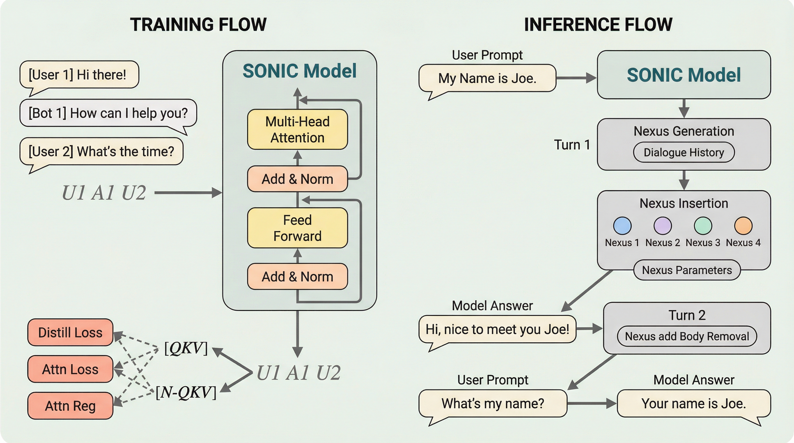 大規模言語モデルのマルチターン対話において、履歴の増加に伴い線形に肥大化するKVキャッシュのメモリ問題を解決するため、履歴セグメントを「Nexus」と呼ばれる少数の学習可能なトークンに集約して圧縮する新しいフレームワーク「SONIC」が提案されました。