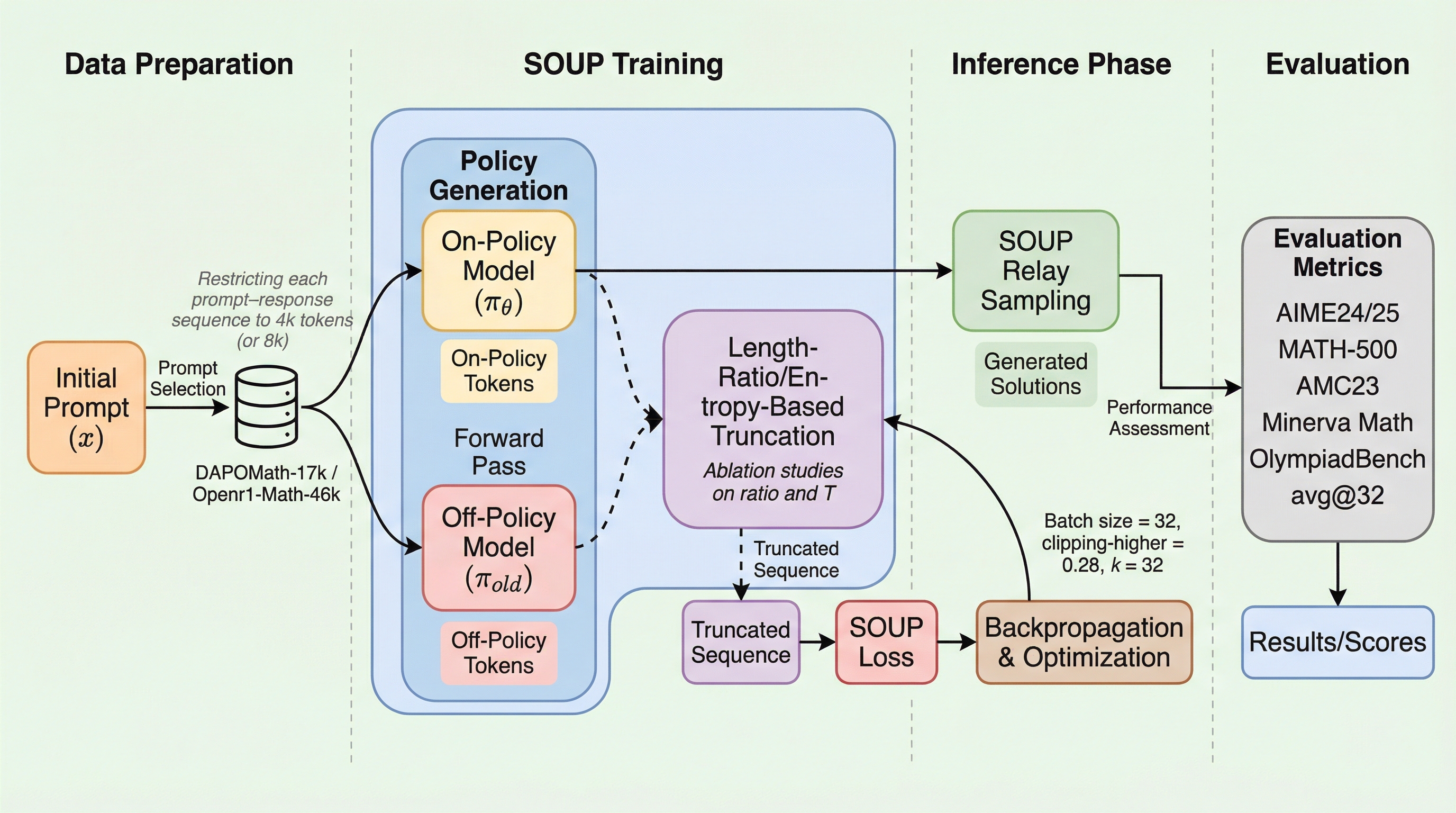 大規模言語モデルの強化学習において、従来のオンポリシー手法は探索の多様性が不足し、性能が早期に飽和するという課題がありました。本研究では、単一の回答サンプル内で過去のポリシーによる接頭辞と現在のポリシーによる継続生成をトークンレベルで統合する新しい枠組みであるSOUPを提案し、学習の安定性と探索能力の両立を図っています。数学的推論タスクを用いた広範な実験の結果、SOUPは標準的なオンポリシー学習や既存のオフポリシー拡張手法を上回る性能を達成し、より安定した報酬の推移と高い探索効率を実現することが確認されました。