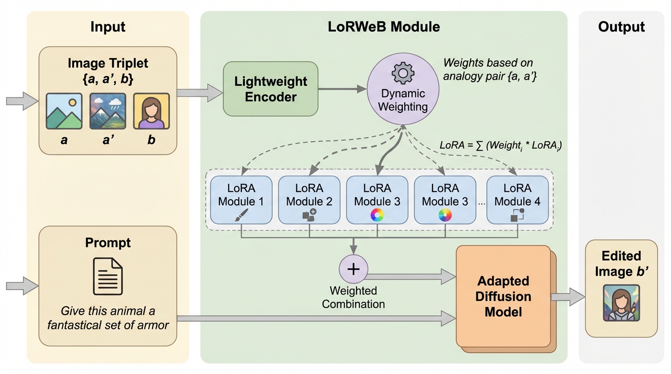 言葉では説明しにくい編集でも、見本の「前→後」画像から変換を読み取り別画像へ移す視覚アナロジーは有用ですが、単一のLoRAに多様な変換を詰め込む設計は未知の変換への一般化を妨げやすいです。 / LoRWeBは、複数のLoRAを「変換の部品」として学習可能な基底にしておき、入力された三つ組(a, a′, b)を手がかりに軽量エンコーダが混合係数を推定して、推論時に1つのMixed LoRAとして動的に合成して注入します。 / 包括的な評価により最先端の性能が示され、学習時に見ていない視覚変換への一般化も大きく改善したと報告されており、LoRAを基底分解して混ぜる方針が柔軟な例示ベース編集に有望だと示唆されます。