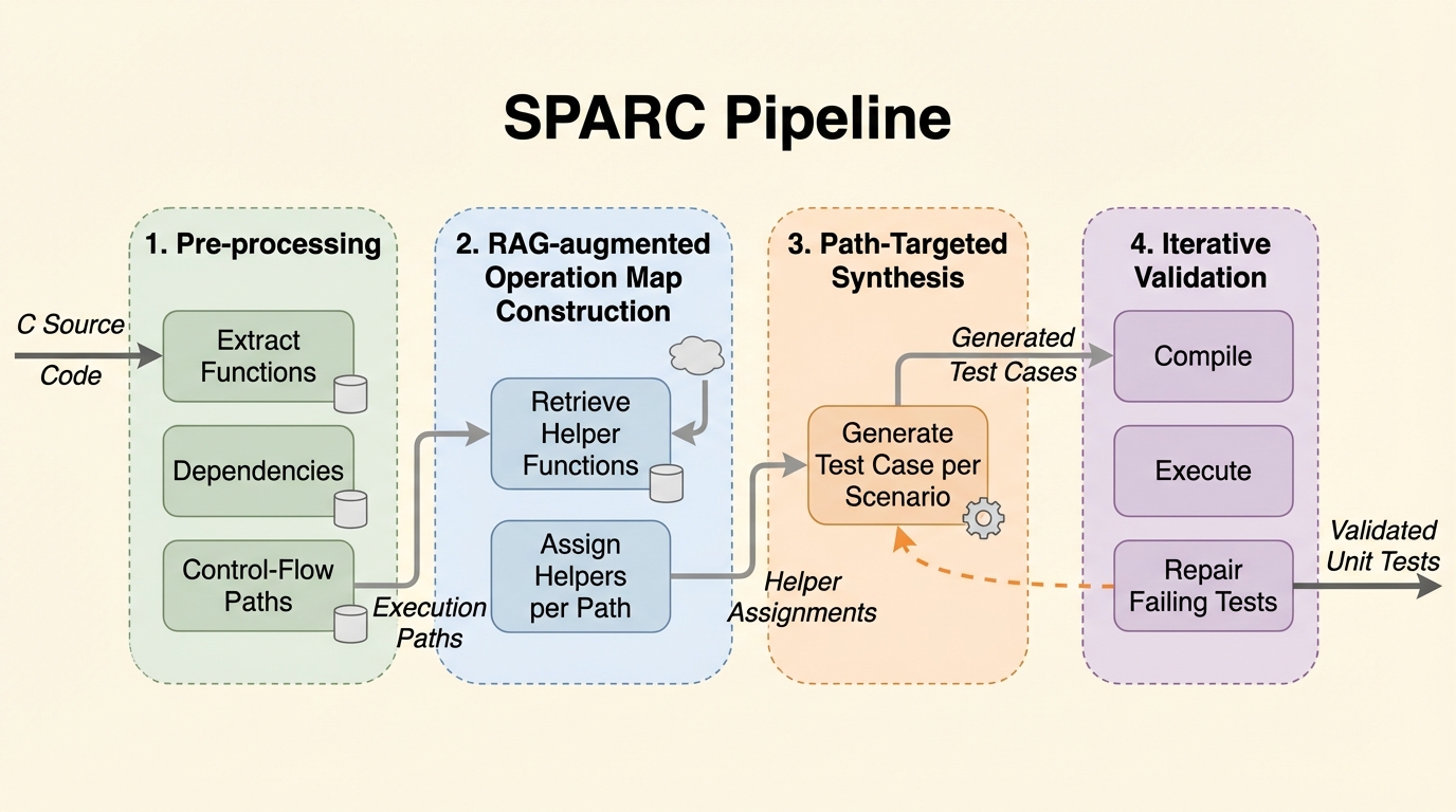 Cではポインタ演算や手動メモリ管理の制約が強く、LLMに意図だけを渡してテストを書かせると、正常系に偏ったり依存関係を捏造したりして、コンパイル不能や意味の薄いアサーションになりやすいです。 / SPARCは制御フローグラフから実行パスごとのシナリオを抽出し、検証済みヘルパーに基づく操作マップで呼び出し先を制限したうえで、パス単位のテスト生成とコンパイル・実行フィードバックによる反復修復を行います。 / 59件の対象で単純なプロンプト生成より行・分岐カバレッジとミューテーションスコアが向上し、複雑な対象ではKLEEに匹敵または上回り、修復後にテストの大半が残って可読性と保守性の評価も高まりました。