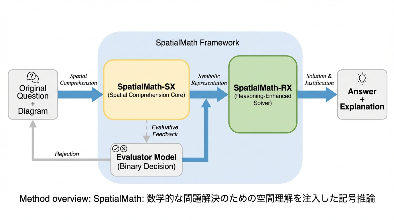 本研究では、視覚的な理解を記号的な推論プロセスに明示的に注入するための新しいフレームワーク「SpatialMath」を提案しました。このフレームワークの核心は、知覚から推論へと至るプロセスを構造化されたパイプラインとして再構築することにあります。SpatialMathは、役割の異なる2つの主要なモジュール、すなわち「SpatialMath-SX(空間理解コア)」と「SpatialMath-RX(推論注入コア)」によって構成されています。これらは、視覚的な情報を一度言語的な構造へと変換し、その構造を基に論理を組み立てるという、人間が数学の問題を解く際のアプローチを模倣しています。 1つ目のモジュールであるSpatialMath-SXは、視覚的な数学コンテンツから構造化された空間理解を抽出することに特化したビジョン言語モデルです。…