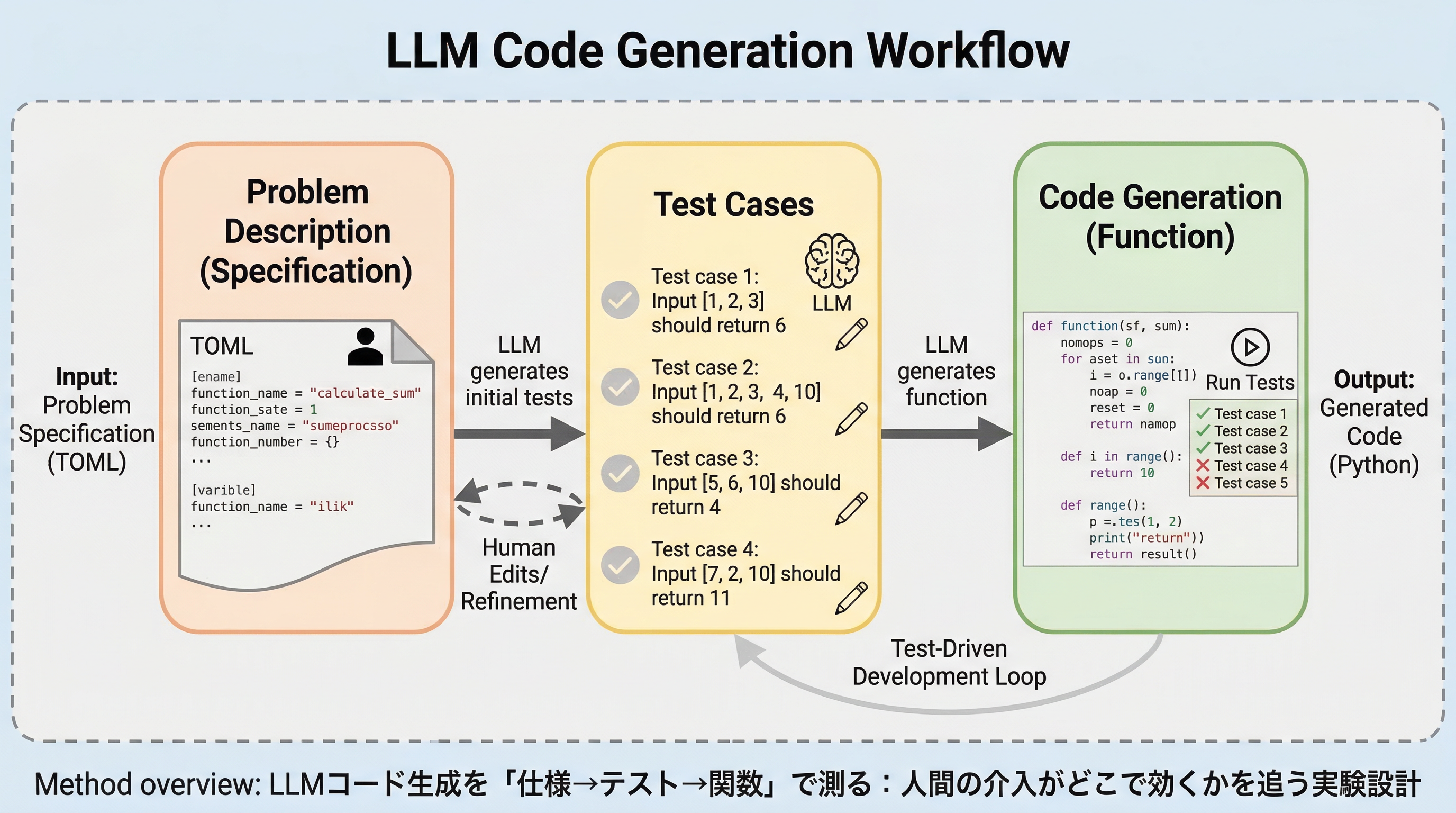 LLM のコード生成は、いまや開発現場のかなり手前まで入り込んでいます。自然言語で指示を出すと関数や補完候補が返ってきて、そのまま実装を進められる場面も増えました。しかし、その便利さの裏で、何をどこまで人間が明示すべきかは、まだかなり曖昧です。特に、要件を雑に伝えたときに起きる取り違えや、テストの弱さによって見逃されるバグは、単にモデルの能力不足だけでは片づけられません。