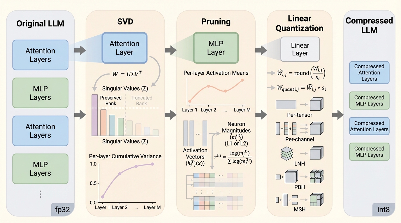 注意層・MLP層・全線形層で非効率の原因が異なる前提に立ち、各層で相性の良い圧縮を割り当てて組み合わせることで、同じ圧縮率でも単独手法よりパープレキシティを良くできると報告されています。 / 注意の射影は分散保持に基づくSVDで低ランク化し、MLPは活性化統計でニューロン単位の構造化プルーニングを行い、最後に全線形層へ学習後8ビットの対称線形量子化を適用する流れです。 / LLaMA-2-7Bでは最大75%の重みメモリ削減(6.86 GB)とWikiText-2のパープレキシティ改善(5.47→4.91)が示され、GPTQより少ないメモリ(7.16 GB)で最大1.9倍のスループット向上も示されています。