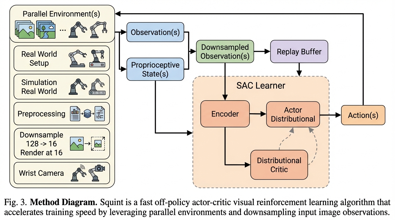 Squintは、カメラ画像と自己受容情報から操作方策を学習する視覚SACで、並列シミュレーションと経験再利用を両立させつつ、学習の実時間を従来の視覚オフポリシー法・オンポリシー法より短くすることを狙った手法です。