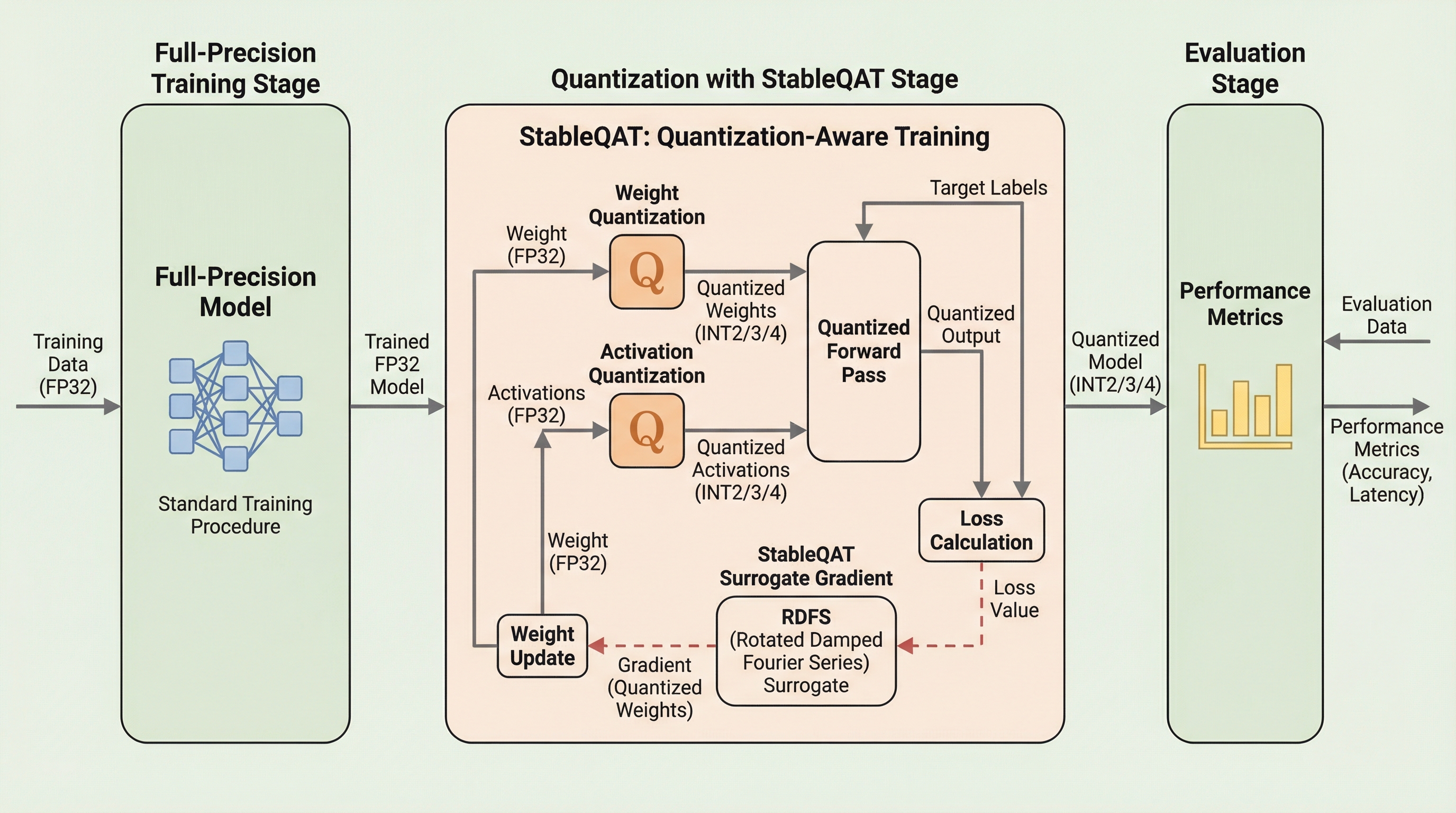 本研究では、低ビット量子化における最適化のボトルネックを解消するための、シンプルかつ柔軟で効果的なフレームワークであるStableQATを提案している。この提案の核心は、量子化演算子の新しい代理関数として「回転減衰フーリエ代理関数(RDFS)」を導入した点にある。RDFSは、丸め操作のスペクトル構造をフーリエ解析によってモデル化し、幾何学的な回転を加えることで、滑らかで有界な最適化方向を導き出すものである。…